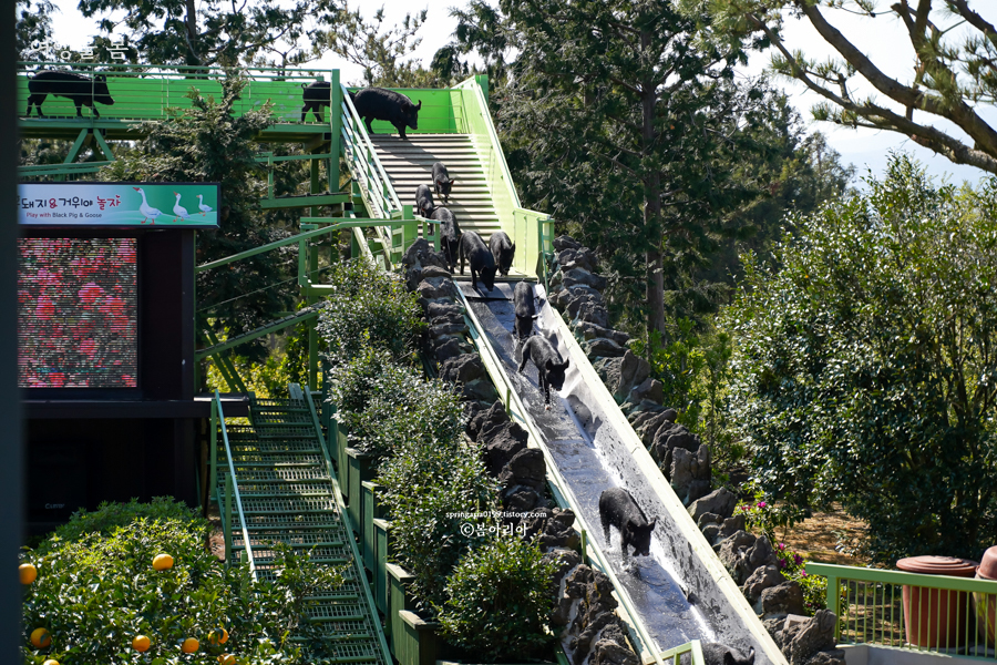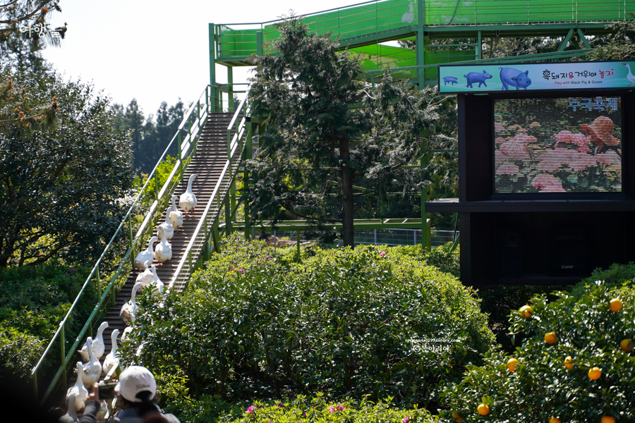 지난 봄에는 코로나 때문에 안 하고, 여름에는 아프리카 돼지 열병 때문에 '흑돼지 & 거위야 놀자'를 볼 수 없었다. 휴애리 수국축제가 진행되고 있는 지금은 공연도 정상운영되고 있다. 처음 볼 때는 흑돼지들이 더 귀여웠는데 몇 번 보니까 거위들이 훨씬 귀엽다. 거위의 수명이 40 ~ 50년이나 된다고 그런다.