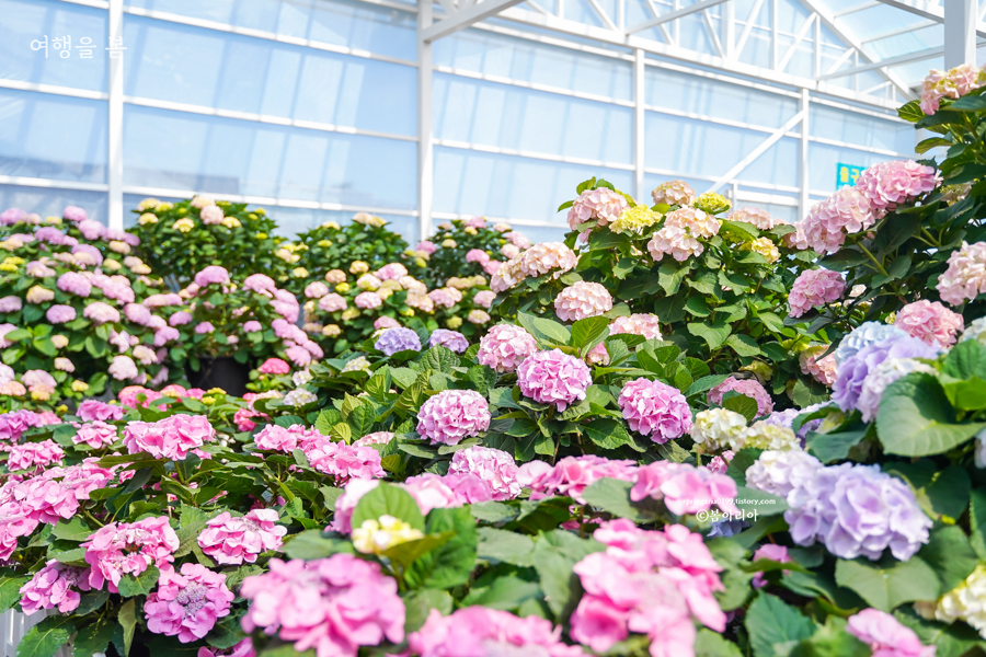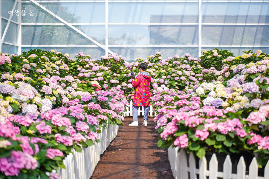 위 사진은 작년 6월 중순에 방문했던 휴애리 수국축제 모습이다. 5월 말 ~ 6월 중순까지가 수국이 최고로 예쁠 때인데 올해는 모든 꽃의 개화가 빨라진만큼 어쩌면 휴애리 수국축제도 5월 중순이면 절정을 맞이할지도 모르겠다. 4월에는 실외 수국 만개가 아니므로 위와 같은 풍경을 볼 수는 없지만 올해 처음으로 수국을 볼 수 있다는 것만으로도 봄 제주도 여행코스로 추천할만한 장소다.