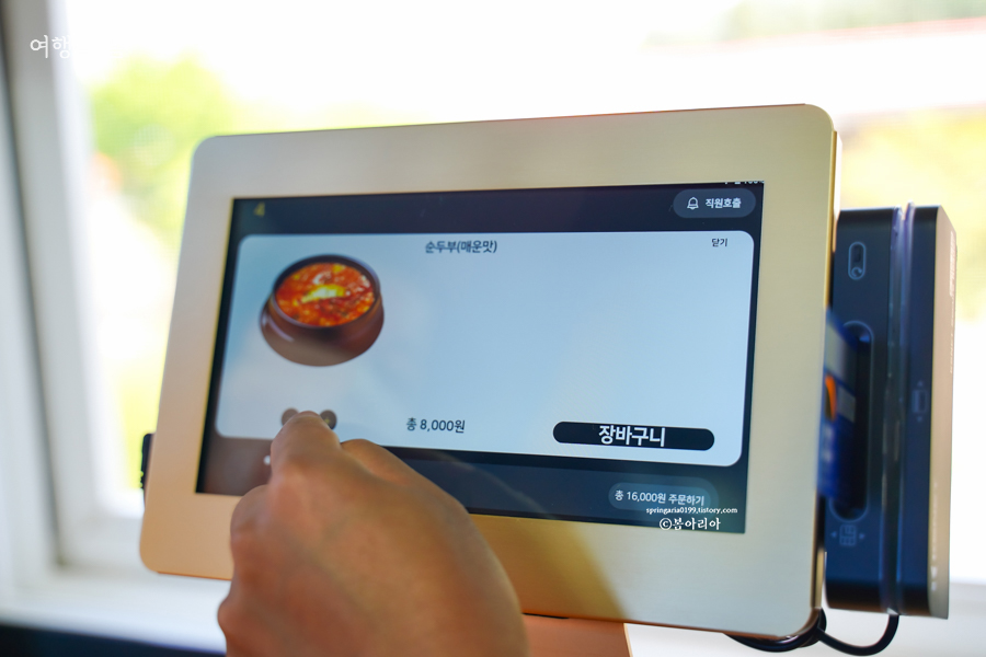 주문은 각 테이블마다 설치되어 있는 패드에서 할 수 있다. 직원을 부르거나 종이에 체크하거나 그런 거 필요 없다. 메뉴는 순두부 딱 하나이며 매운맛 또는 순한맛을 선택할 수 있다.