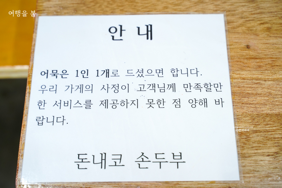 제주 돈내코 순두부 영업시간은 오전 11시에서 오후 2시까지 딱 3시간 뿐이다. 일요일은 휴무라 일주일 동안 이곳에서 식사할 수 있는 시간은 고작 18시간이다. 아저씨가 이곳을 제주도민맛집으로 여러번 추천해왔음에도 늦게 찾아온 이유는 이 영업시간 때문이었다. 일요일에 걸리거나, 오후 2시를 넘겼거나.