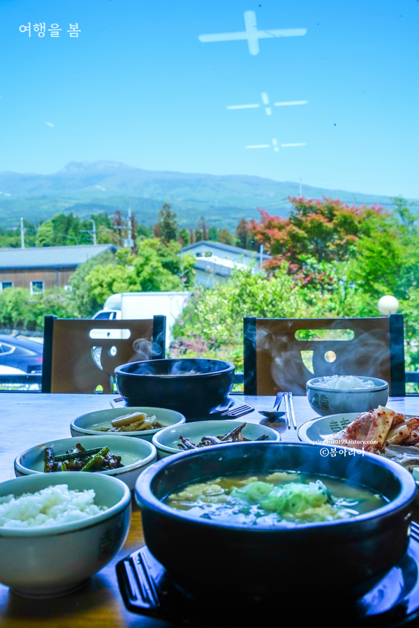 한라산뷰가 완벽한 식당이라면 여기다. 식당으로 들어가기 전 주차장에서 본 한라산 뷰는 어느 카페에 뒤지지 않는다. 물론 한라산 뷰는 우리 집이 더 좋다(ㅋ). 가을에 이사를 해야해서 요즘 집을 보러 다니고 있는데 마음에 드는 집이 없다. 내 첫번째 조건은 지금의 우리집처럼, 집에서 한라산이 아주 잘 보이는 거다. 일어나자마자 매일매일 한라산을 보는 건 제주살이에서 놓칠 수 없는 특권이랄까.