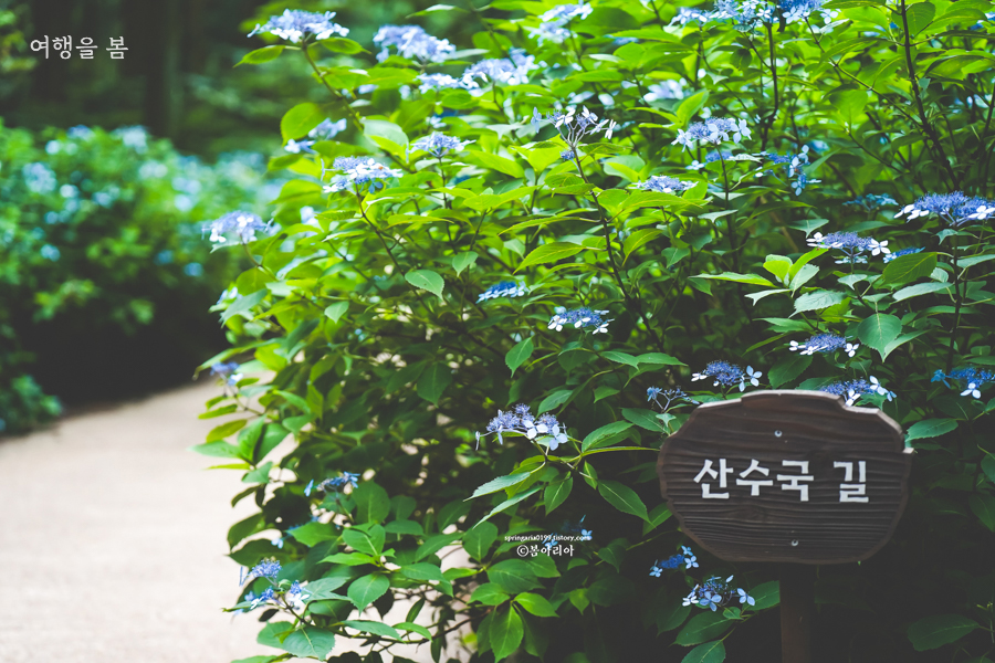 산수국길이라 다른 수국에 비해 개화시기가 조금 늦다. 때문에 수국 시즌을 놓쳤다!하는 사람들도 뒤늦게 찾아가기 좋은 제주 수국 명소다. 사려니 숲길이야 제주도 가볼만한곳으로 워낙 유명하고 지난해 무장애나눔길이 생겨 산책하기도 완벽하다. 산수국길은 데크길이 아닌 사려니숲길 붉은오름 입구에서 곧장 5분 정도 직진하면 보인다. 다른 수국에 비해 탐스러운 맛은 없지만 오후 늦게 방문하면 어둠을 밝혀주는 듯 그 파란빛이 묘하고, 요정이 나올 것 같은 분위기를 만날 수 있다.