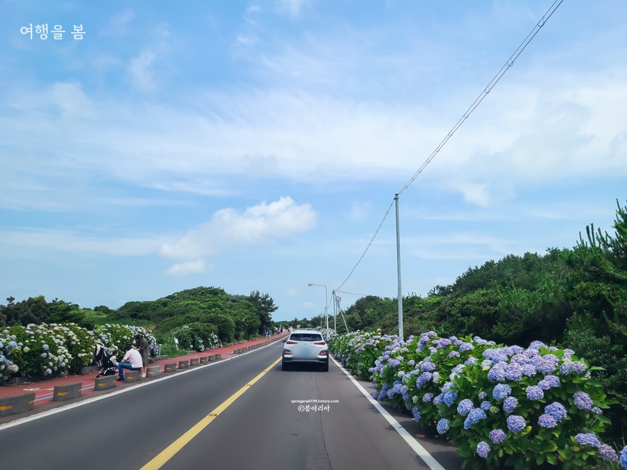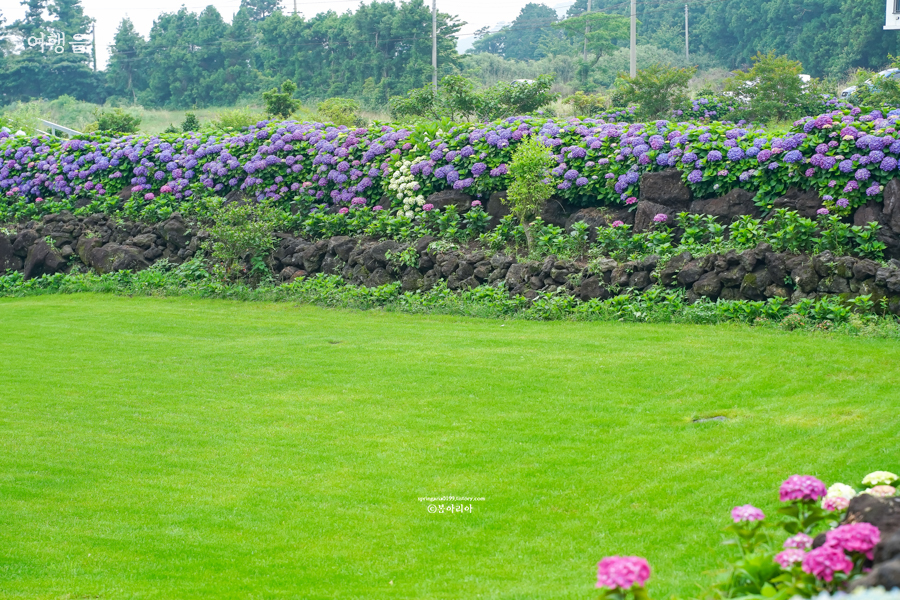 제주 수국 명소로 사람들이 좋아하는 장소 중 하나지만 나는 여기가 왜? 그렇다. 사진에 보이는 것이 전부다. 더 풍성했었는데 가지치기를 못해서 수국이 탐스럽지 않다는 소리도 있었기 때문에 올해는 더 풍성해질지도 모르겠다. 수국 색깔이 예쁘기는 하지만 도로변이라 사진찍기 위험하고, 산책할 수 있는 곳도 아니므로 굳이 추천하는 장소는 아니다.