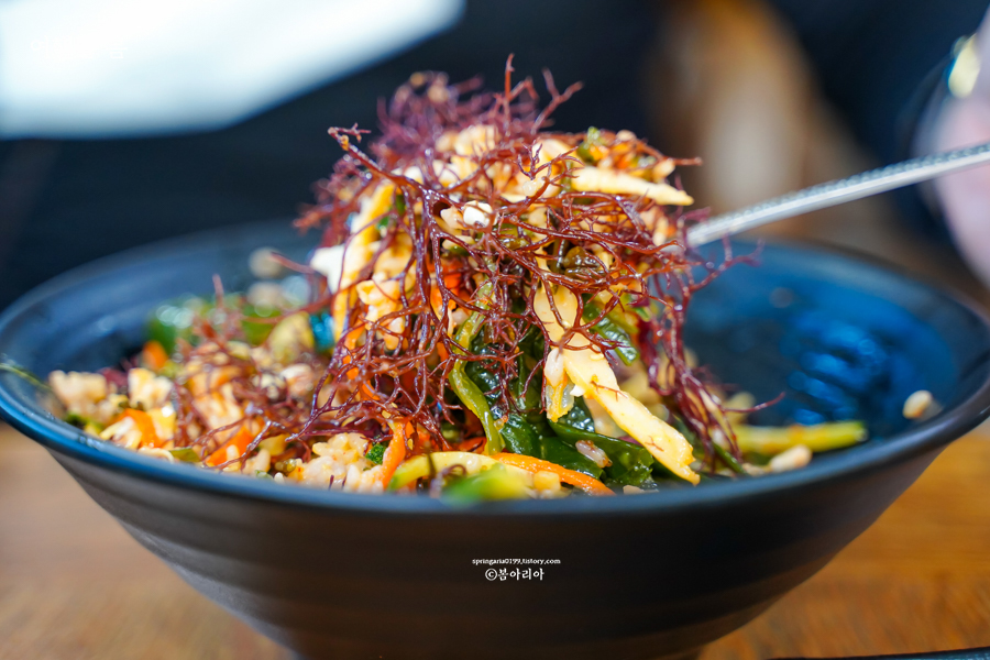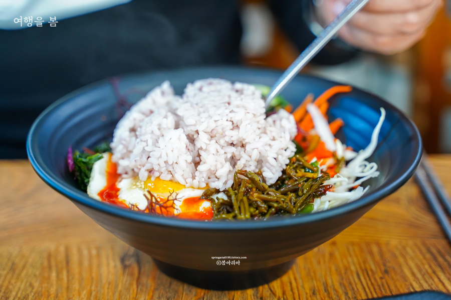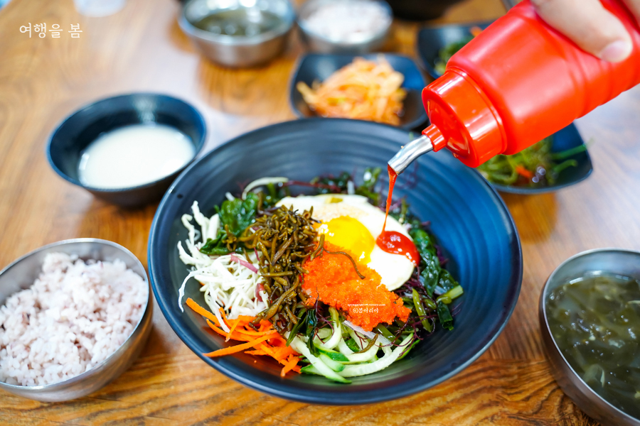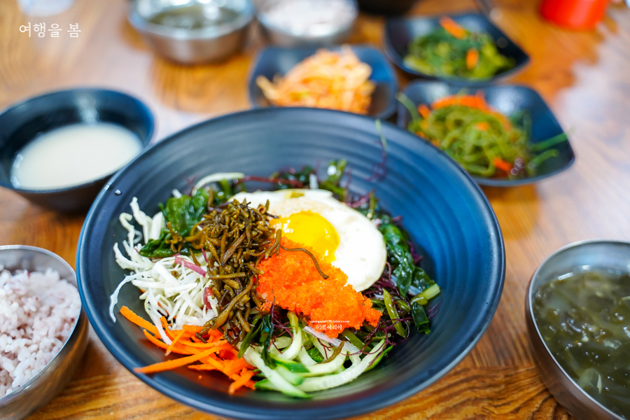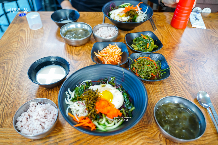 해초비빔밥은 8천원이다. 양이 푸짐하여 그 밑에 당연히 밥이 들어있겠지하였으나 저건 해초와 채소다. 밥과 미역국은 따로 나온다. 관광지치고 8천원이면 비싸지 않은 가격이면서 양도 상당하다. 달걀은 하나 들어있지만 고기는 없으니 고기 좋아하는 사람이라면 입맛에 맞지 않을 수 있다. 반찬은 3가지가 나왔고, 열무김치 말고는 맛이 없었다. 미역국은 대박 맛있었다. 미역국이라면 손도 안 대는 친구도 이런 맛은 처음이라며 국물 하나 남기지 않고 다 먹었다.