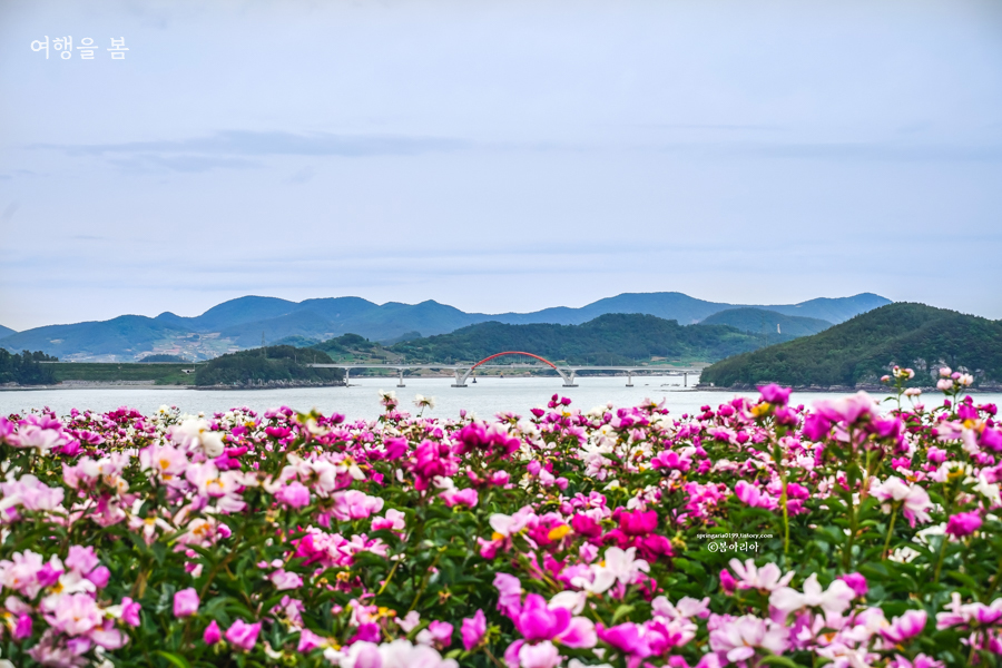절정은 지났지만 아직 작약은 볼만했다. 하지만 이 작약밭을 보기 위해 이번 주말 고흥을 온다면 그건 추천하지 않는다. 작약이 지고 나면 계절에 따라 다른 꽃을 심을지는 모르겠다. 왼쪽으로 적금도 - 빨간 적금대교 - 낭도까지 한 눈에 보이는 멋진 곳에 예쁜 꽃밭이 있으니 모두의 근심을 앗아가겠다. 고흥은 산세가 수려하여 볼 때마다 감탄한다.