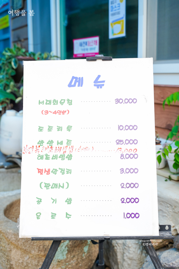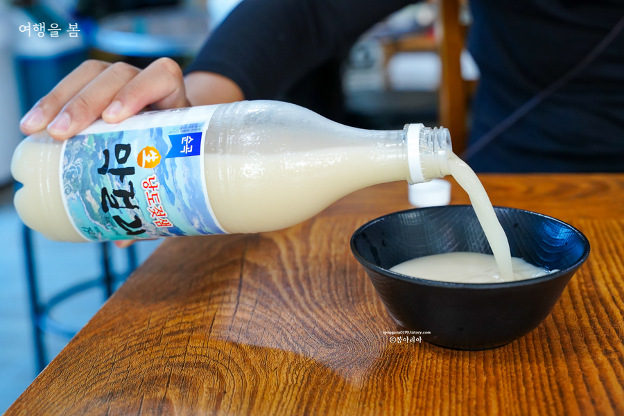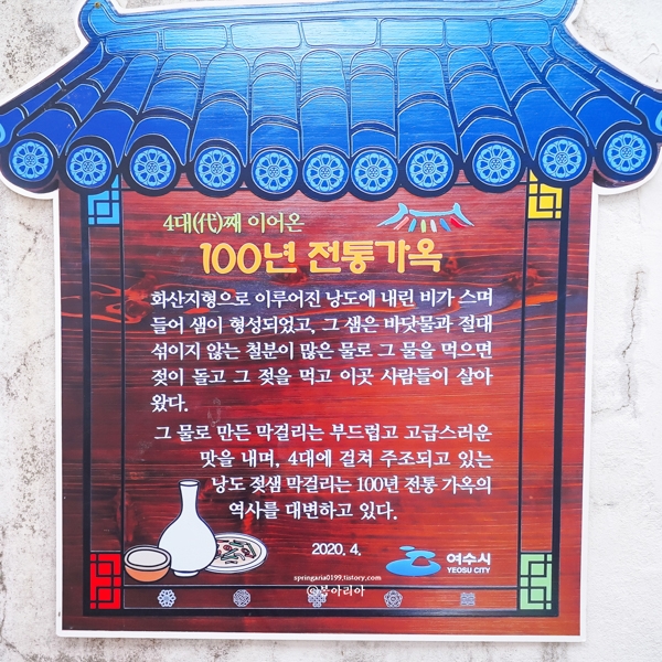 한 잔 따라 마셨더니 100년 전통은 전통이었다. 대량으로 생산할 수 없도록 100년 전통 그 방식 그대로 지금까지 막걸리를 만들고 있다더니 그래서 이렇게 순하고, 달달하면서 맛있는 건가 생각이 든다. 낭도에 샘이 하나 있는데 그 물을 먹으면 산모의 젖이 돈다고 하여 젖샘이라고 부른다. 젖샘 물로 만들어 낭도 젖샘 막걸리다. 가게에서 마시면 3천원, 구매해가는 것은 2천원이다.
