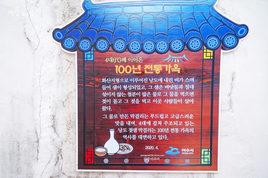 100년 전통가옥을 구경할 수 있나 싶었지만 그 가옥에는 사람들이 살고 있어 구경하거나 사진을 찍을 수는 없다. 4대째 이어오는 100년도가식당에는 100년 주조장이 있다. 이곳에서 직접 막걸리를 만들고, 전통방식을 고수하여 하루에 만들 수 있는 양이 많지 않다고 한다. 이곳에서 만든 막걸리는 타지역으로 보낼 수 있는 양이 아니기에 낭도에서 모두 소비되고 있으니 낭도 젖샘막걸리는 오직 낭도에서만 먹을 수 있고 구매할 수 있다.