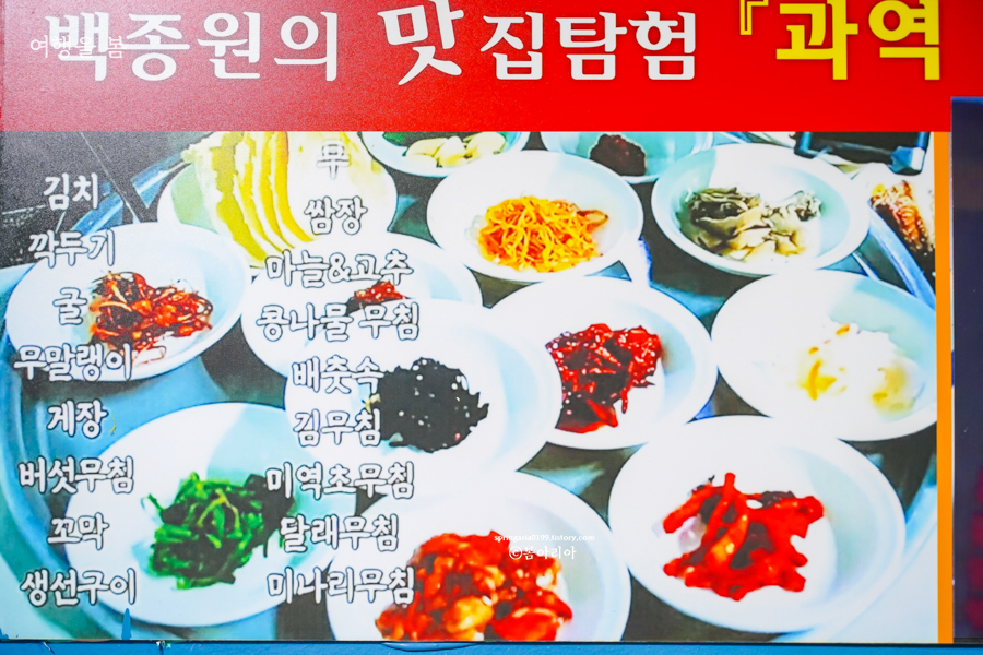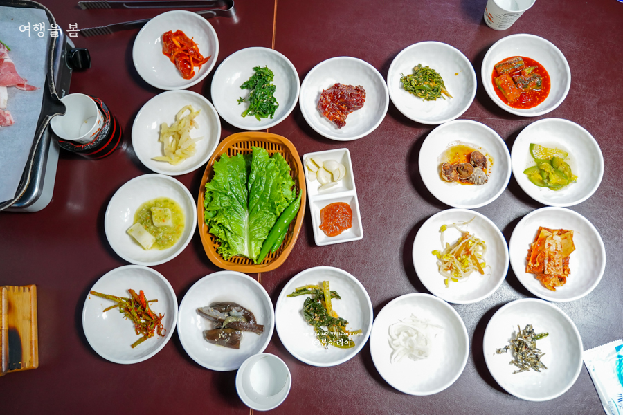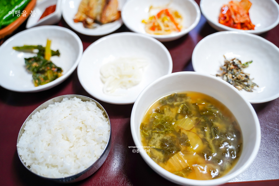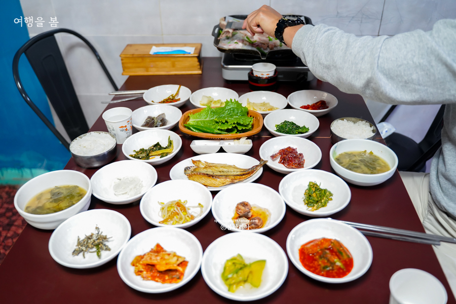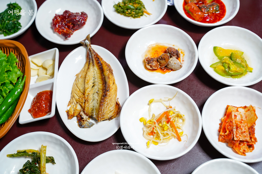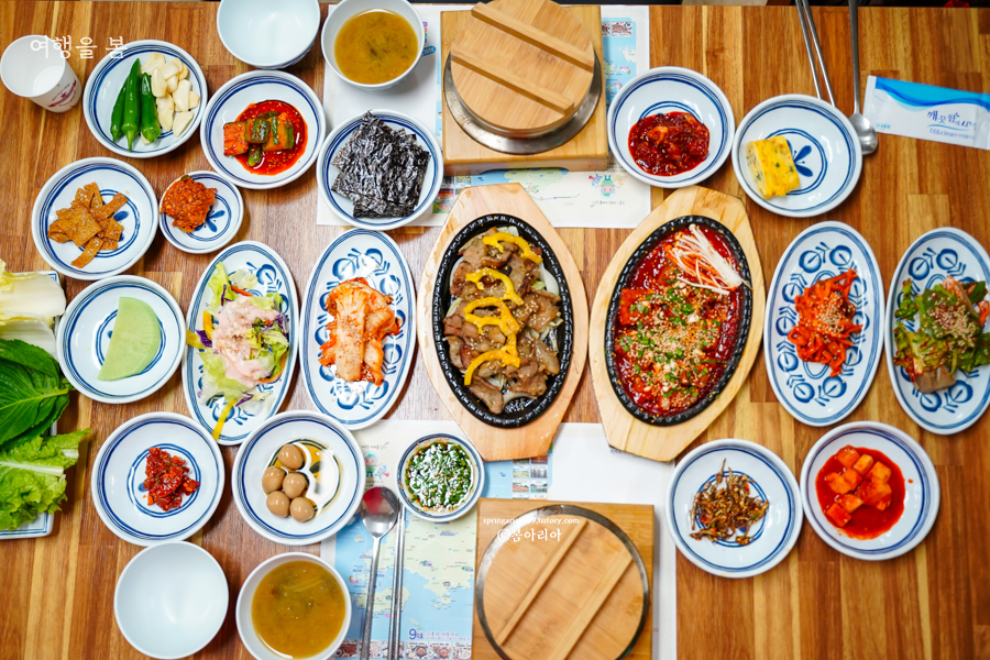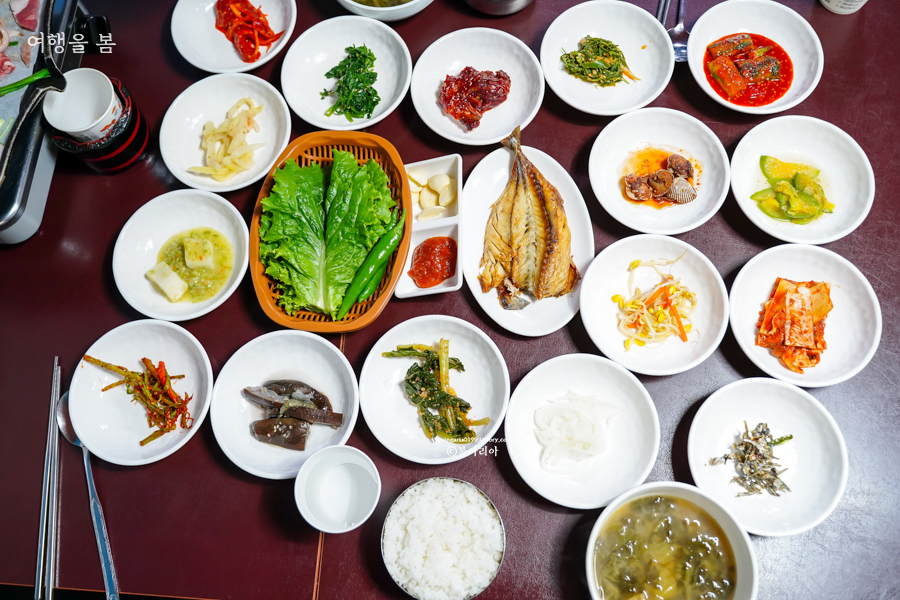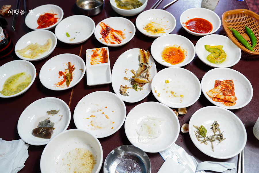 과역 기사님식당에서는 17가지 반찬에 국도 나오고, 삼겹살이 나온다. 사진에 적혀있는 반찬과는 조금 달랐는데 계절마다 나물의 종류가 조금씩 바뀌는 것 같다. 고등어 구이 포함해서 정말 17가지의 반찬이 나왔고, 국과 삼겹살까지 합치니 식탁이 좁게 느껴질 정도다.