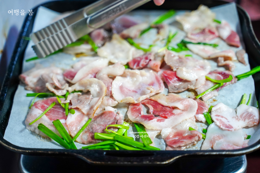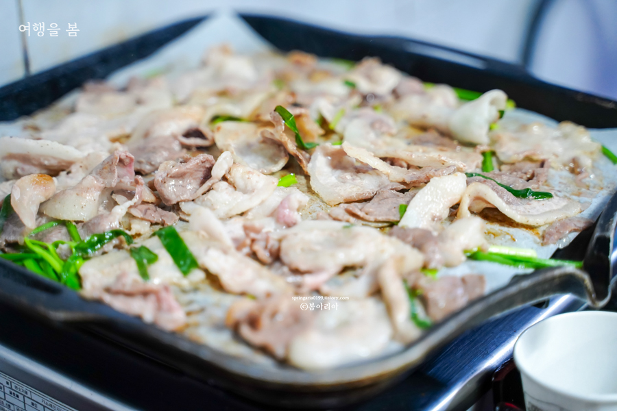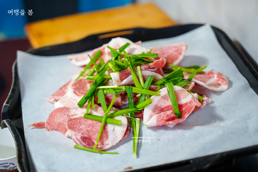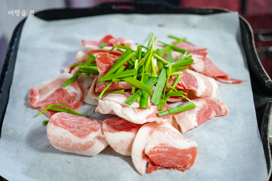 2인 주문에 나오는 삼겹살의 양은 이 정도다. 방문하기 전에 미리 평점을 보았더니 혼자 주문하나 둘이 주문하나 삼겹살의 양이 같다고 그런다. 혼자 가서 먹는 것이 더 많이 먹을 수 있으니 둘이 방문하더라도 따로따로 앉아야 한다나?