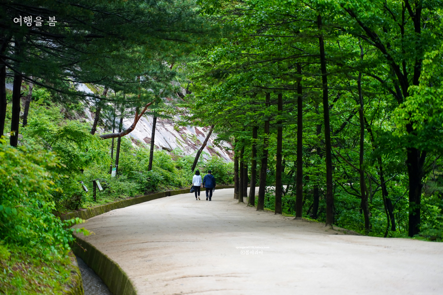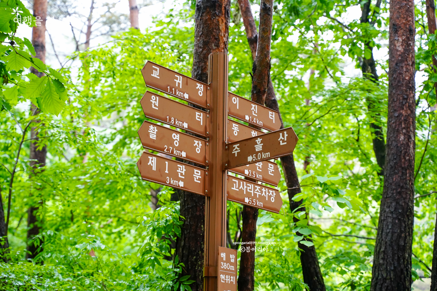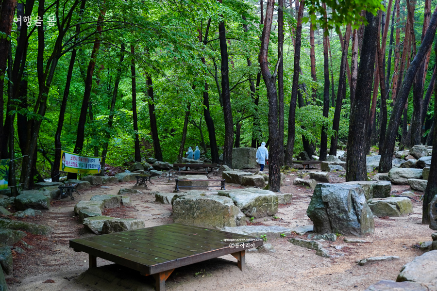 갑자기 쏟아지는 비에 모두 비옷을 입는다. 올라오는 동안 비는 오지 않았지만 혹시 몰라 입구 마트에서 2천원 주고 비옷을 사왔다. 천천히 걸었고, 평탄한 길이기에 휴식이 따로 필요하지 않다. 주차장에서 2관문까지 소요시간은 1시간 30분이었고 내려올 때는 사진을 찍지 않아 1시간이 조금 덜 걸렸다.