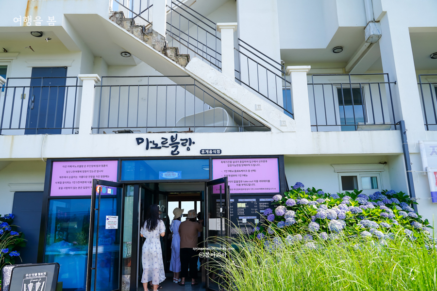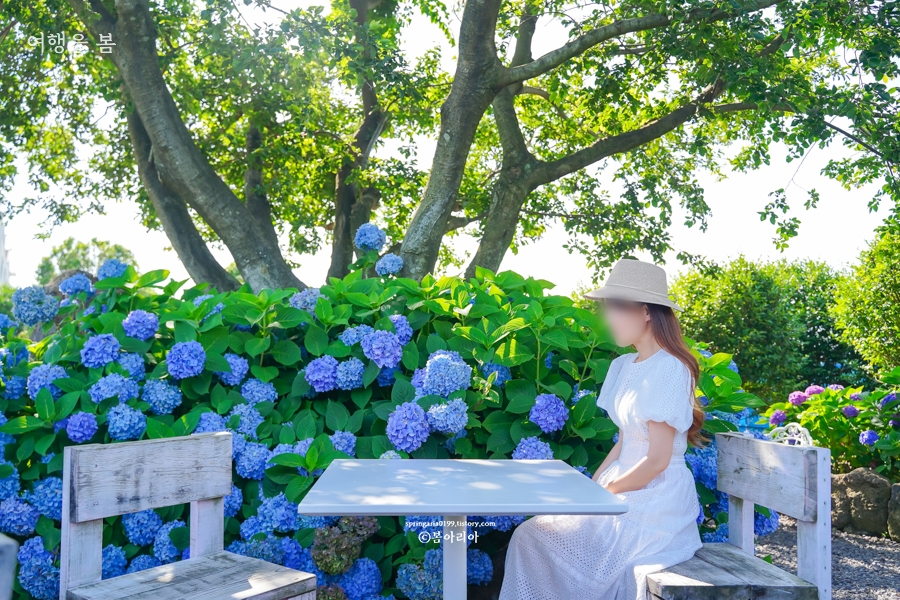 제주 수국명소 다른 곳보다 화려한 색감의 수국이 많기 때문에 여기는 무조건 흰색 원피스가 진리다. 수국 중에서도 보라색 수국을 특히나 좋아하는 친구는 마노르블랑 수국축제를 제일로 좋아한다. 대정읍 안성리 수국이나 안덕면 동광리 수국도 이런 색감이라서 보라색 수국을 좋아하는 사람들이라면 위 2곳을 방문하면 좋다. 두곳은 무료기도 하니까.