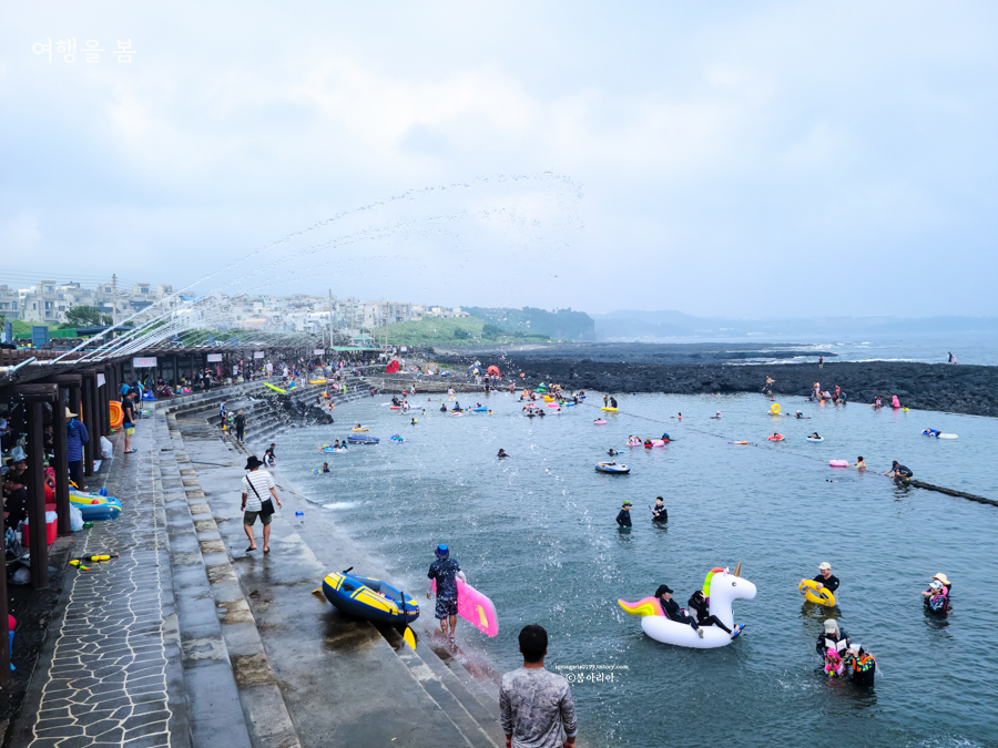 물을 팡팡 뿌려주니 재미있고, 앞은 바다뷰에, 날씨가 좋을 때는 한라산도 다보이니까 재미와 뷰를 다 가지고 있는 제주도 여름 물놀이 장소다.