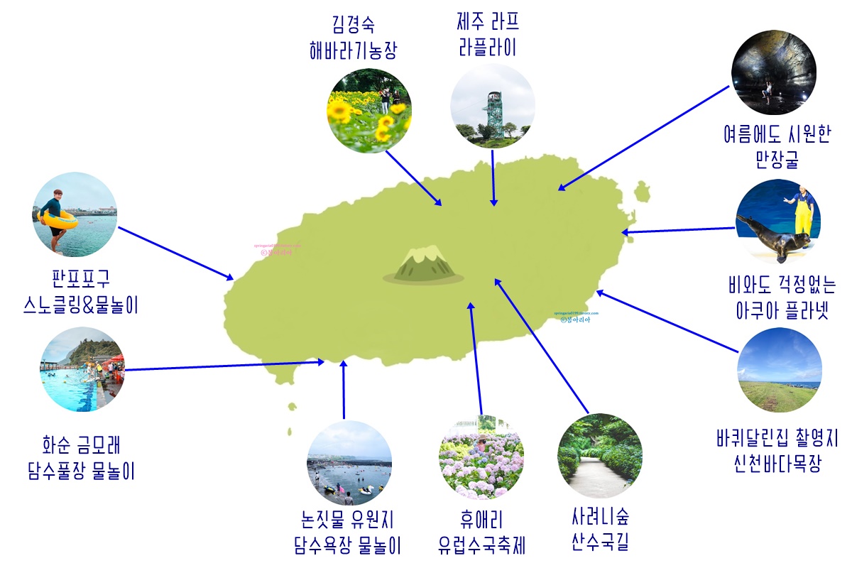 7월 제주도 가볼만한곳 10곳은 7월에 가면 더 좋은 장소와 더운 여름에도 어울리는 제주 여행지, 작년에 주변에 소개했다가 반응이 좋았던 곳을 골라 물놀이, 꽃구경, 실내관광지, 산책할 수 있는 곳 등 두루 넣었다. 장마기간이고 폭염이 예상되는 7월인만큼 실내관광지도 필수다.