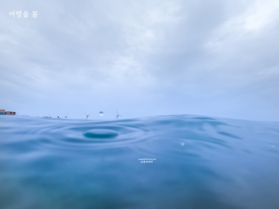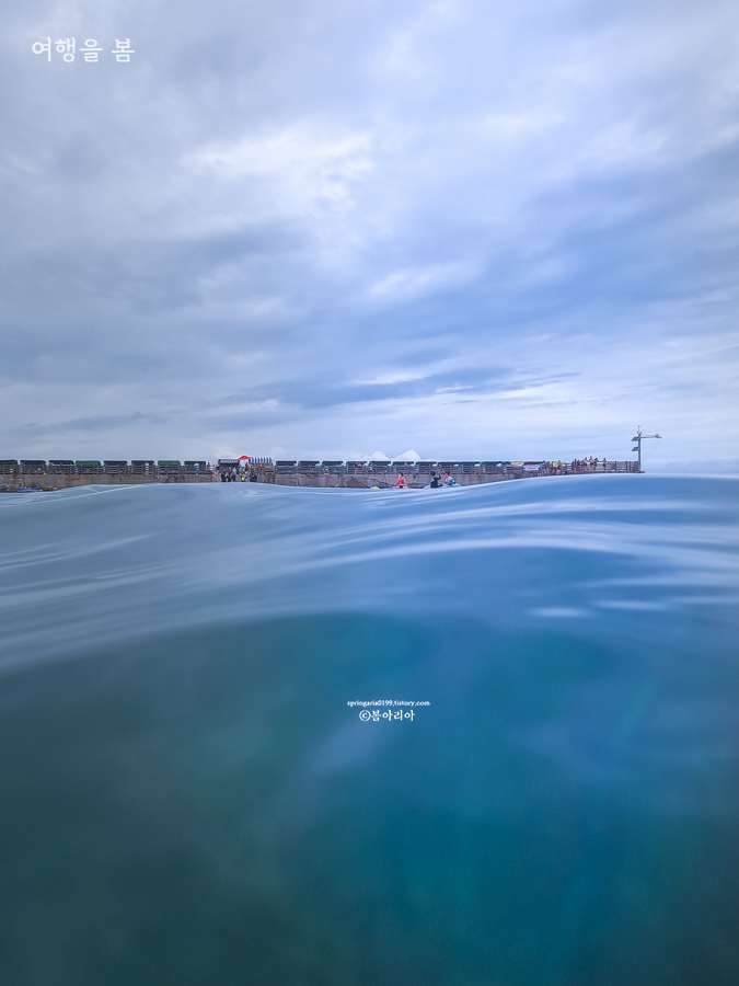 흐리거나 약간 비 내리는 날 물놀이하는 것이 더 재미있어 그런 날씨에 다녀온 판포포구 스노클링. 대신에 바닷속 풍경을 남기에는 아쉬운 점이 있었으나 비 맞고 즐기는 물놀이는 어린 시절을 떠올리게 해 정말 아이가 된 것처럼 원없이 놀았다.