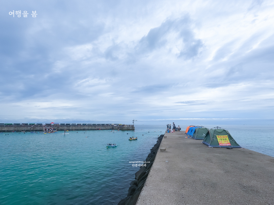 작년에 이쪽은 텐트 대여 구역이 아니라서 도민이나 여행객들이 돗자리나 각자의 텐트를 펼치고 놀았는데 올해는 이쪽도 텐트대여 구역이 되어버렸다. 그래도 일부 자리는 남겨놓아 우리는 이쪽에 돗자리를 펼쳐놓고 물놀이를 했다. 판포포구 횡단보도 건너 무료 주차장을 만들어 놓아 주차난은 없다. 하지만 사람들이 그 횡단보도 건너는 것이 귀찮아 자전거도로에 주차하고 그러는 모습은 참 보기 싫다.