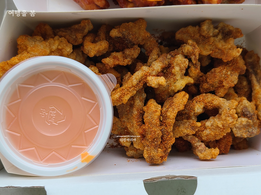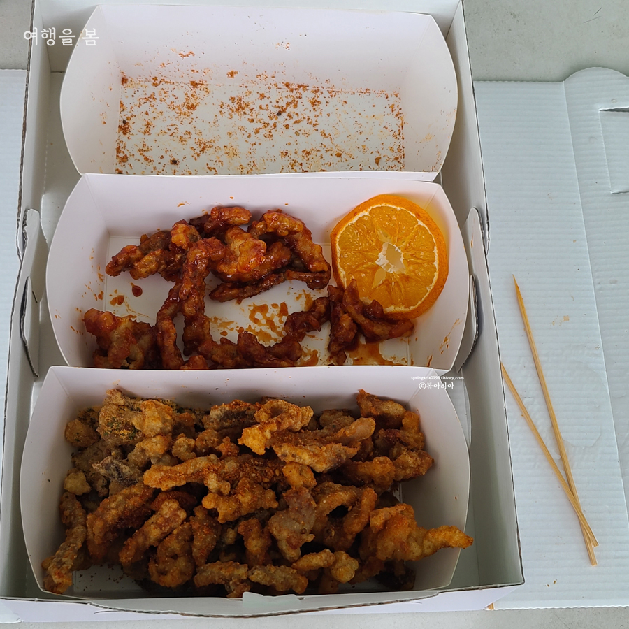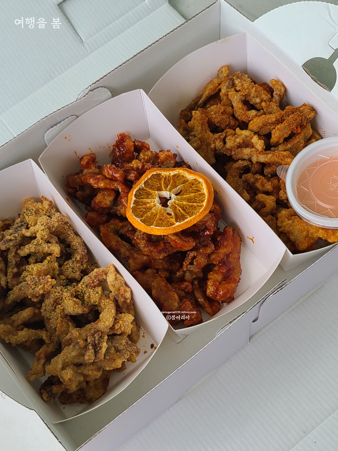 친구 집이 안덕이라 금악에서 20분 밖에 안 걸렸고만 따뜻하지도 않고 다 식었다. 포장해 온 친구가 새로 한 거 아니고 어디 있던 거 담아줬다고 그런다. 식감이 말라비틀어진 것처럼 딱딱하고, 고기를 먹고 있다는 느낌이 안 든다. 꿀봉강정하고 허니치즈는 그나마 먹을만 했지만 식감이 즐겁지 않고, 커민칠리는 향부터가 너무 이국적이라 손이 안 간다.
