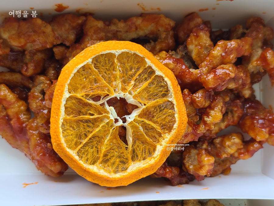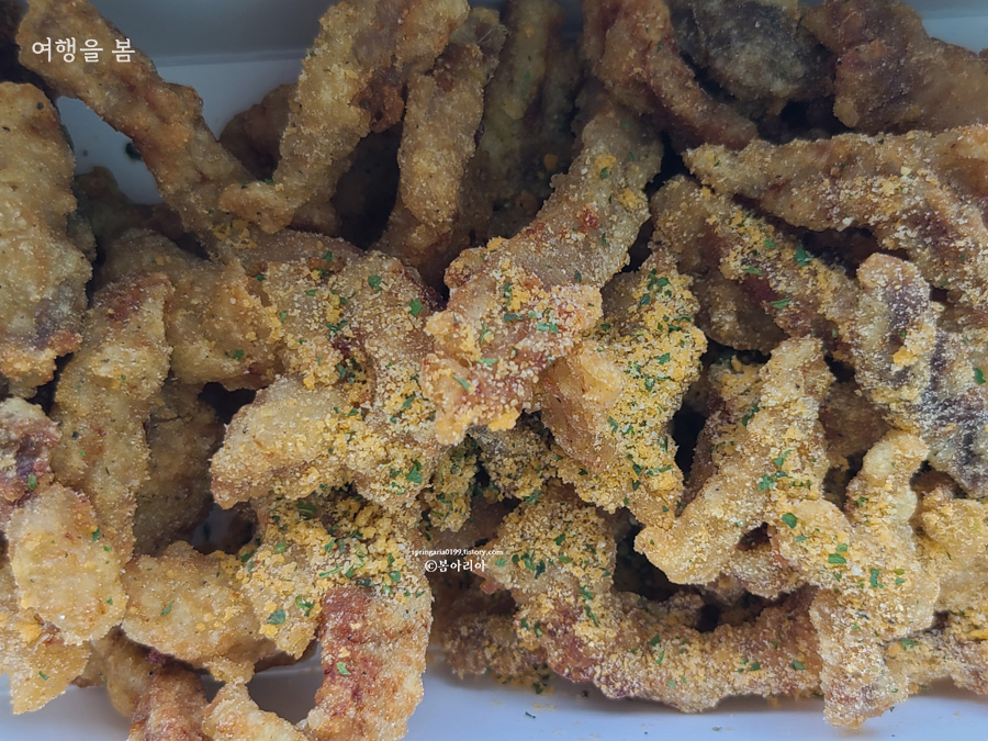 음, 돼지강정인지 그냥 반죽강정인지 모르겠다. 고기 씹히는 식감도 없고, 아니 진짜 고기가 없었다. (방송을 안 봐서 모르지만) 고기를 얇게 썰어서 튀기기 때문에, 그러니까 고기가 진짜 너무너무 얇아서 저렇게 반죽만 있는 강정이 나올 수도 있다는 거. 애초에 육즙은 기대할 수 없는 꿀봉.