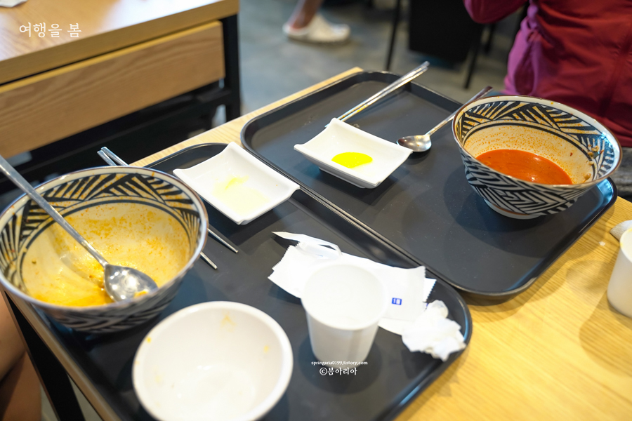 가게로 들어오면 자리에 앉는 것이 아니라 셀프 계산대에서 주문을 먼저 한다. 라면이 다 만들어지면 'OO번 손님' 부르고 음식을 가져오는 것도 셀프다. 다 먹으면 사진 오른쪽처럼 치우는 것도 셀프다.