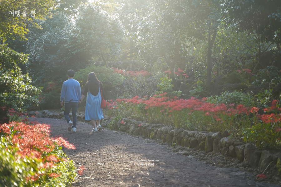 휴애리 하늘정원의 가장 큰 장점은 핑크뮬리와 한라산 배경으로 정말 제주도다운 사진을 찍을 수 있다는 거다. 제주 핑크뮬리 명소 중에서 한라산이 가장 예쁘게 보이는 곳은 휴애리 자연생활공원이다. 선선해진 날씨에 넓은 공원을 산책하기에 알맞고, 가을을 대표하는 꽃무릇길도 낭만적이다.