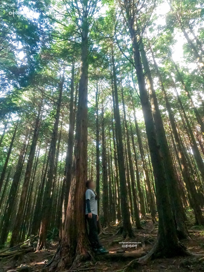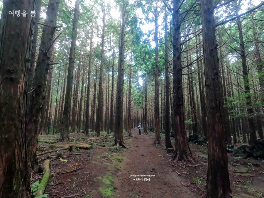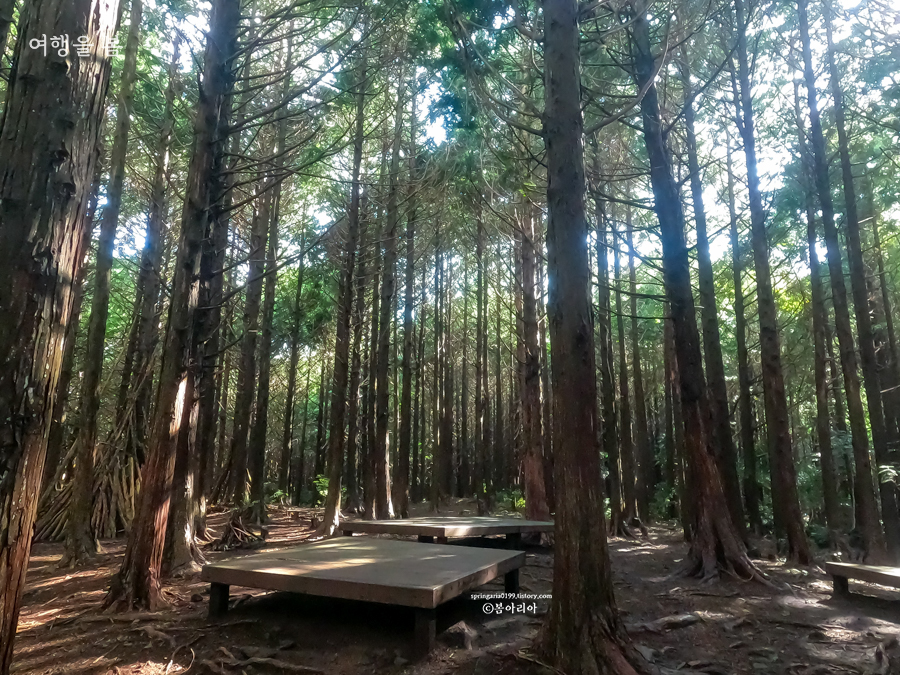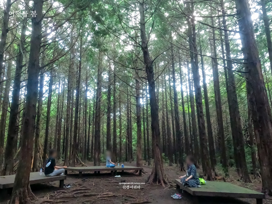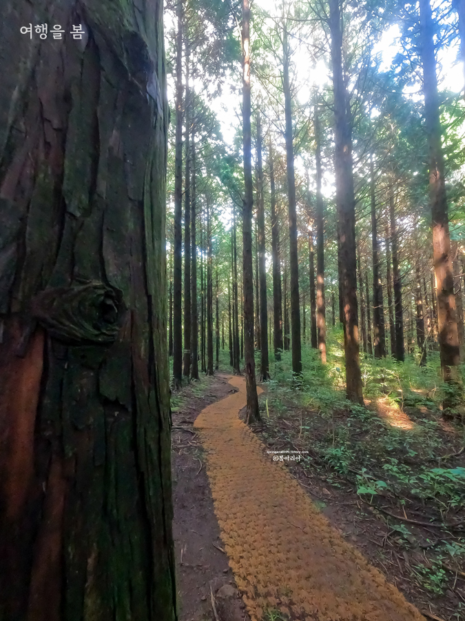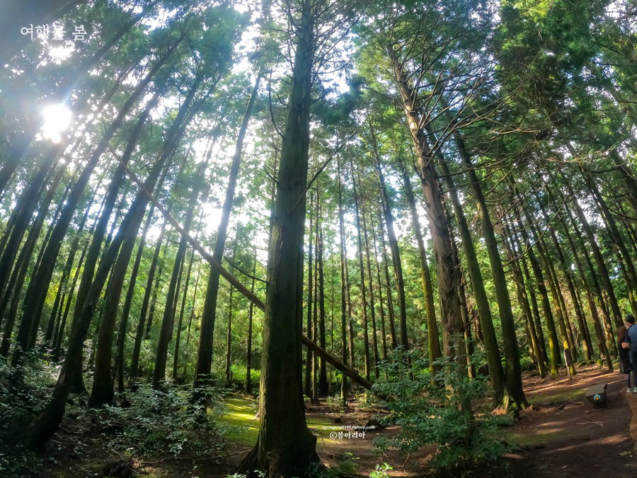 주차장에서부터 20분 정도를 걸어오니 킹덤:아신전 촬영지 머체왓 숲길 편백나무 숲이 시작된다. 편백나무와 삼나무 등 여러나무가 있지만 모두를 아울러 편백낭 쉼터, 편백낭 치유의 숲이라 한다. 서귀포 추억의 숲길 편백나무 숲도 참 예뻤는데 여기도 참 예쁘다.