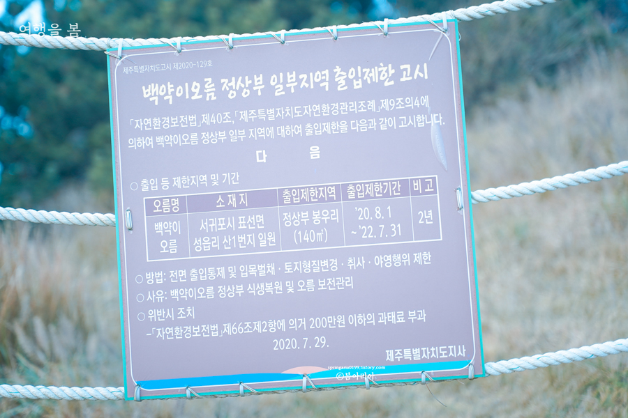 제주 백약이 오름 출입제한 정상부 2년 출입 통제 8월부터 백약이 오름을 갈 수 없다고 하던데? 그거 나도 봤는데 정상부 일부만 출입금지라서 상관 없을 것 같아. 아니 근데 사람들이 아예 출입
