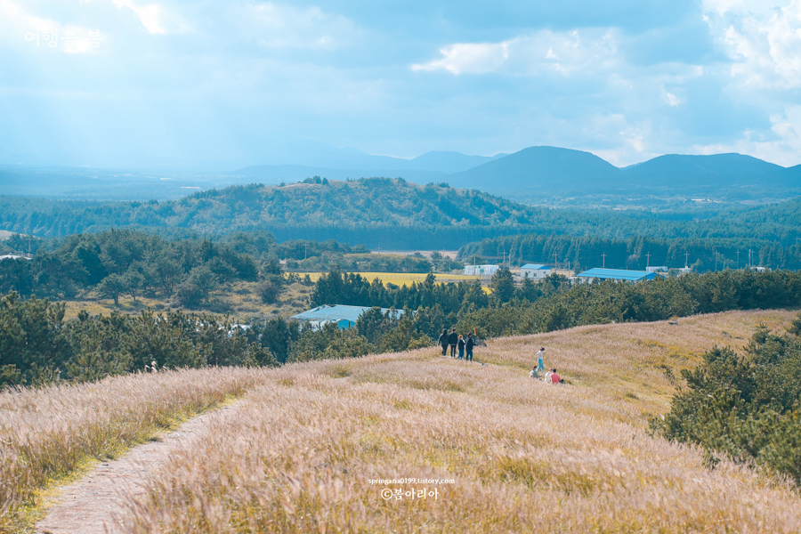 수크령 밭에 돗자리를 펼치고 소풍을 즐기는 사람도 있고, 손자와 함께 둘레길을 걷거나 삼각대를 세워놓고 커플사진을 찍거나. 제주도 오르기 쉬운 아부오름에 피어난 목가적 풍경과 가을이 무르익는다. 아부오름 소요시간은 오를 때 5분, 내려올 때 5분이다. 분화구 전체길을 걷는다면 10분 ~ 15분 추가되고 의자에 앉아 잠깐 쉬거나 사진을 찍는다면 10분 정도 더 추가된다. 넉넉히 계산해도 아부오름 소요시간은 40분이면 된다.