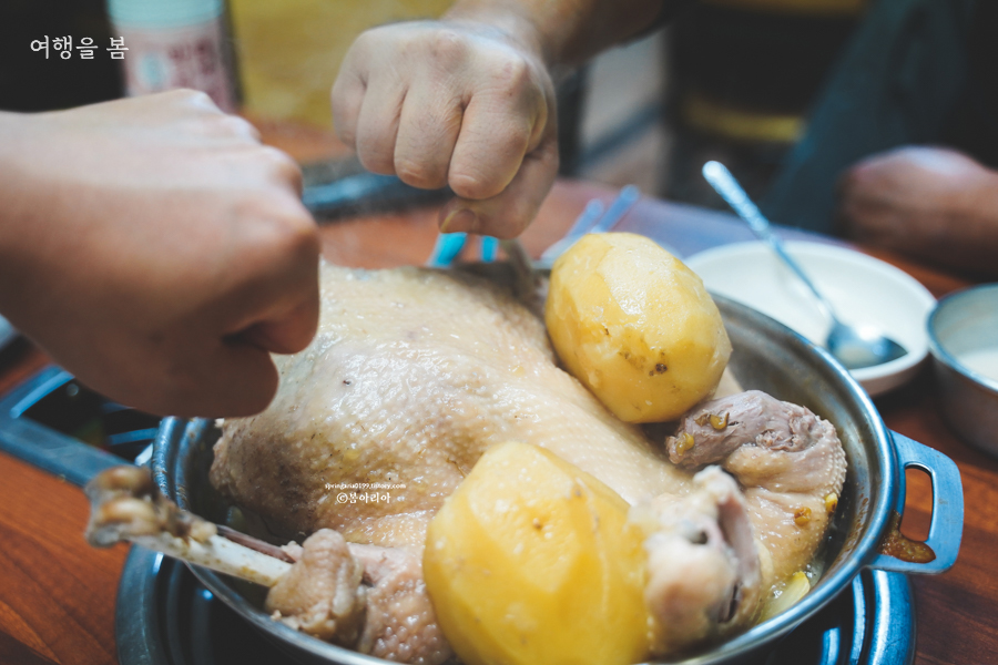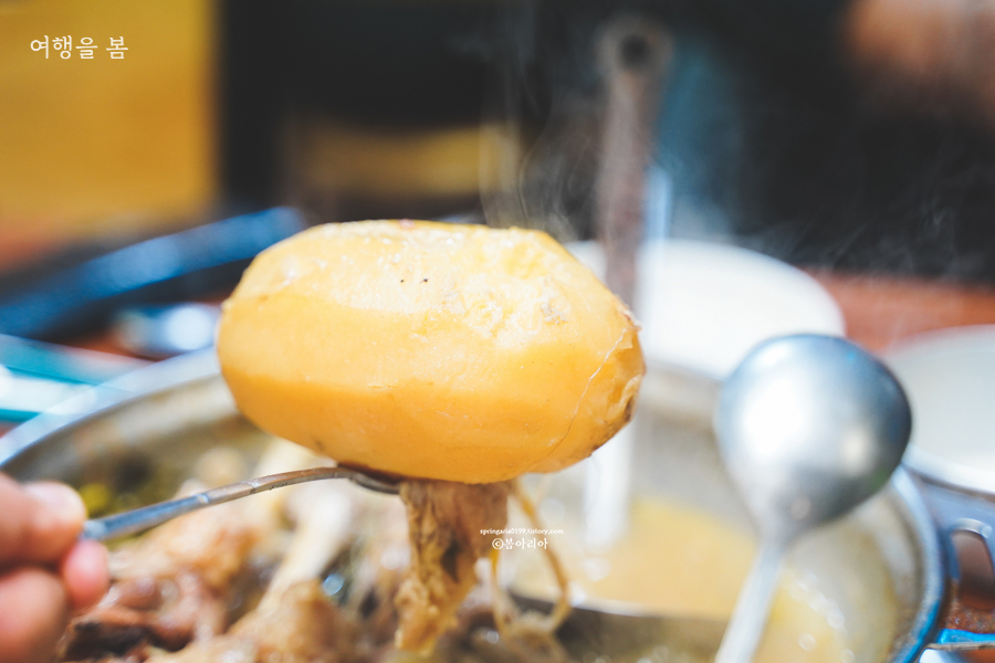 샤브샤브를 먹고 나면 닭백숙이 나온다. 닭이 얼마나 큰지 냄비 밖으로 튀어나올 지경. 자리가 부족해 감자는 사장님이 따로 들고 와서 넣어주신다.