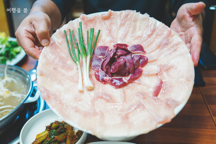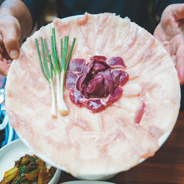 놀라운 비주얼, 토종닭 샤브샤브다. 저건 닭생고기와 닭똥집이다. 회처럼 나오는 건데 생으로 먹기도 한다고 그런다. 샤브샤브는 생고기로만 가능하기 때문에 흔하게 먹을 수 없다.