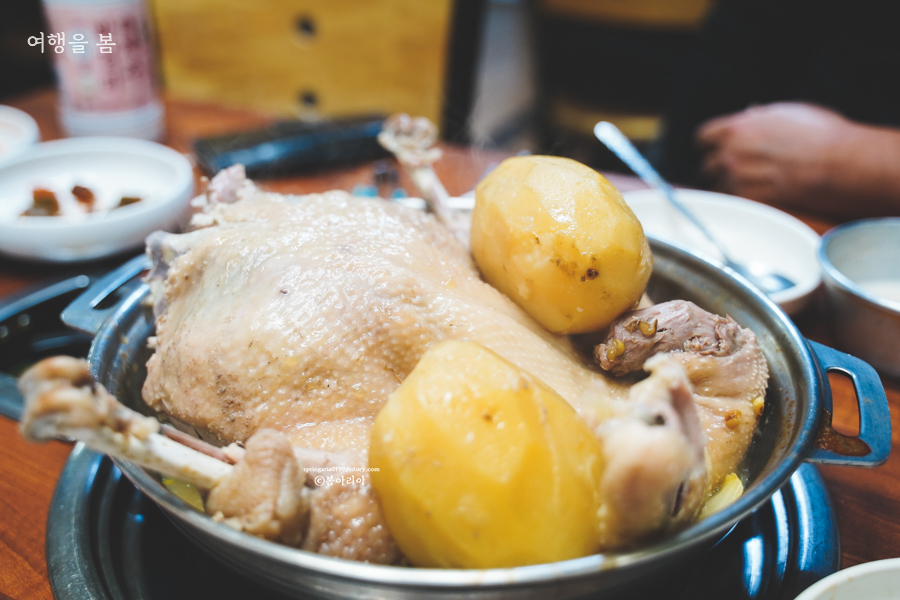 저 냄비에 들어있는 건 모두 제주산이다. 감자는 제주 대정읍 출신(?)이고, 냄비보다 더 큰 닭은 엉또폭포 출신 토종닭이다. 최근 치킨 크기를 두고 논란이 있었는데 여기서는 그런 말 쏙 들어간다. 이곳의 오픈이 오후 3시부터인 이유는 엉또에서 닭을 직접 잡아오기 때문이다. 닭은 사장님 아빠가 키운다고 들은 듯하다.