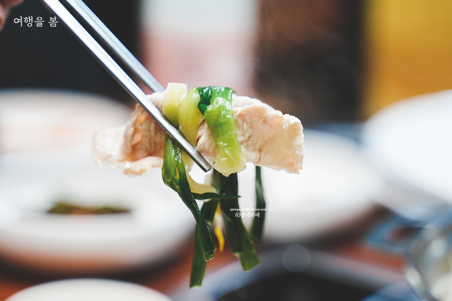 다른 샤브샤브 먹는 것과 같다. 야채부터 넣어주고 닭생고기와 닭똥집도 넣어준다. 몇 초면 익고 소금이나 양파절임, 갓김치, 파 등에 싸 먹으면 된다. 살이 진짜 뽀얗다. 닭샤브샤브는 처음 먹어봤는데 매우 맛있더라. 아마 닭이 좋아서겠지.