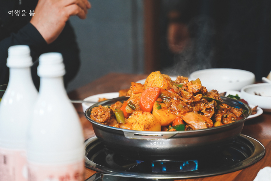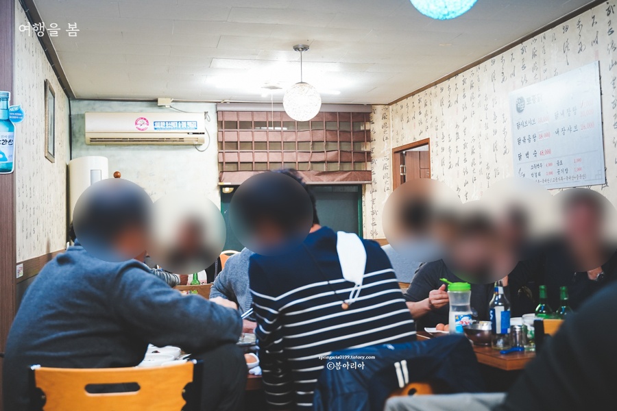 현지인 맛집 말고 토박이 맛집에서는 사진찍기 힘들다. 그래서 메뉴판도 못 찍었고. 옆테이블에서 닭볶음탕을 먹기에 몰래 찍었다(!) 이곳의 메뉴는 모두 성인 남성 4명이 와야 먹을 수 있을 정도로 양이 엄청나다. 아저씨도 3명 오면 음식을 다 못 먹고 간다고 그런다.