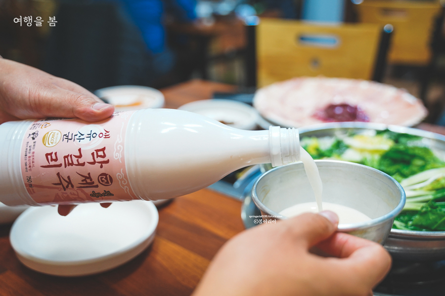 아저씨와 친구들이 오면 요거 하나 주문해놓고 막걸리 20병은 까고 간다는 술을 부르는 술맛집(?)이니 우리도 막걸리가 빠질 수 없지. 실제로 테이블에 술이 없는 곳이 없다. 술이 술술 들어갈 수밖에 없는 이유는 4명이서 58000원짜리 닭샤브샤브 하나 주문하면 코스로 요리가 나오니까 안주를 추가 주문할 필요가 없다는 것. 샤브샤브, 닭백숙, 닭죽을 먹는 약 2시간 동안 그냥 술이 쭉쭉 들어간다.
