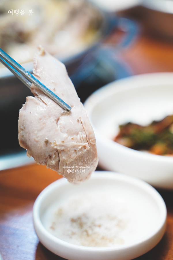 6개월을 정성으로 키워 3kg도 넘는 토종닭이기에 살코기도 큼직큼직하고 생닭이기에 뽀얗고 또 뽀얗다. 암튼 토종닭 백숙 먹으면서 이렇게 부드럽고 고소한 살코기는 처음이었다. 치킨 먹을 때마다 보았던 거무데데한 닭뼈 따윈 여기서 상상도 할 수 없다.
