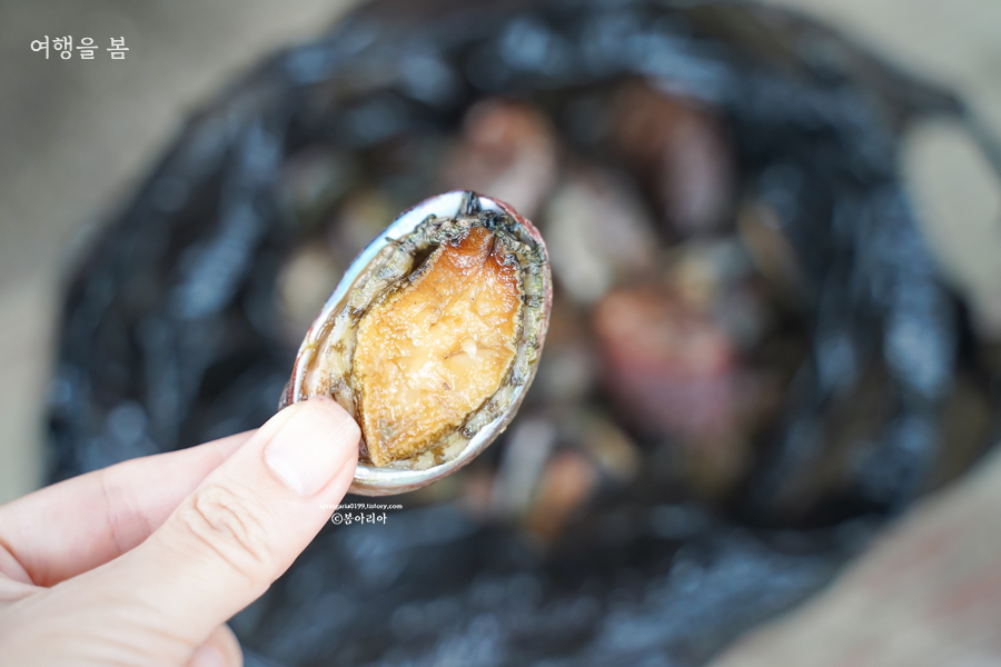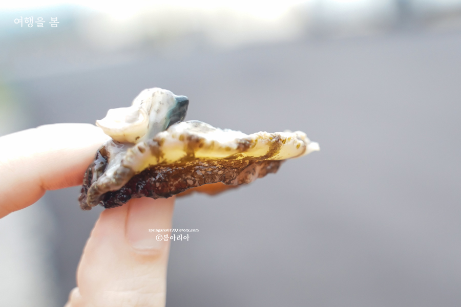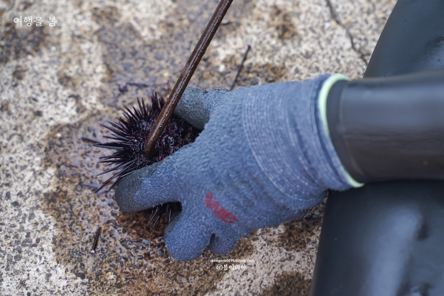저 안에 제주 오분자기가 있다. 어촌계로 돌아가 짐을 정리하실 동안 성산 앞바다에서 잡아온 성게를 맛보기로 했다.