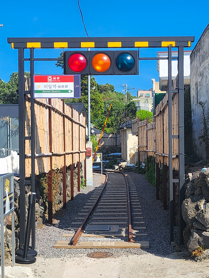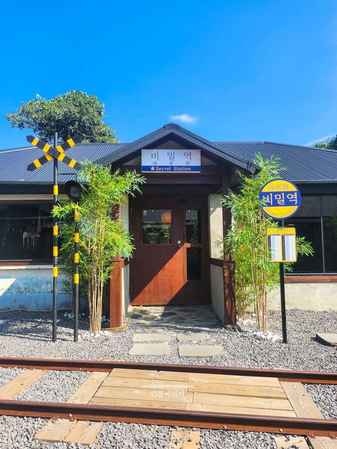 올레브릿지하우스 펜션을 찾으면 그 옆이 비밀역 입구다. 별도 주차장은 없고 카페 가까이에 공영 주차장이 있다. 한 30초 거리에 화장실 앞 공터가 있는데 그곳에도 주차할 수 있다.
