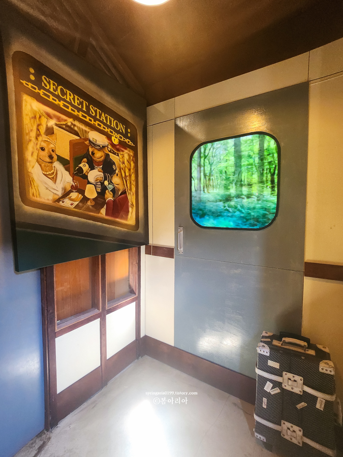 진짜 기차에 올라탄 줄. 창문으로는 숲을 지나가는 듯한 영상이 계속 이어져 기차에 올라탄 느낌 그대로. 그리고 여행용 캐리어가 소품으로 있고, 이거 가지고 기찻길에서 사진 찍어도 된다.