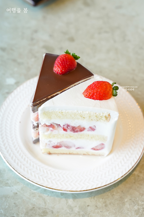 홀케이크는 어차피 주문도 안 되고, 매장은 품절이고 우리가 선택할 수 있는 건 조각 케이크. 가장 있기 있는 프랑스 할머니 초코케이크와 딸기 케이크. 가격은 각각 6800원, 6500원. 다른 곳 케이크와 달리 느끼하지도 않고, 빵도 식감이 좋은 편. 이 정도면 딸기밭 케이크 1호도 반절은 먹을 수 있을 것 같다.