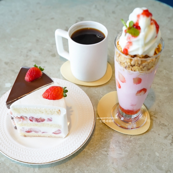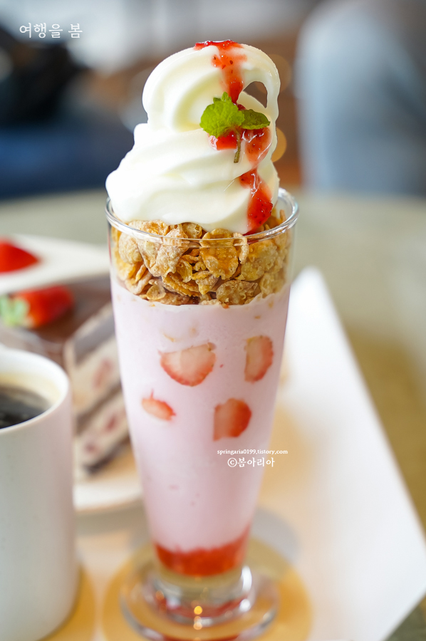 여기 딸기 파르페가 미쳤다. 비주얼도 예쁜데 맛이 맛이, 그동안 먹어봤던 파르페 중에서 1등이다. 밑에서부터 차곡차곡 담겨있는 모든 것들이 맛있다. 스타벅스 딸기 음료와도 비교가 안 된다.