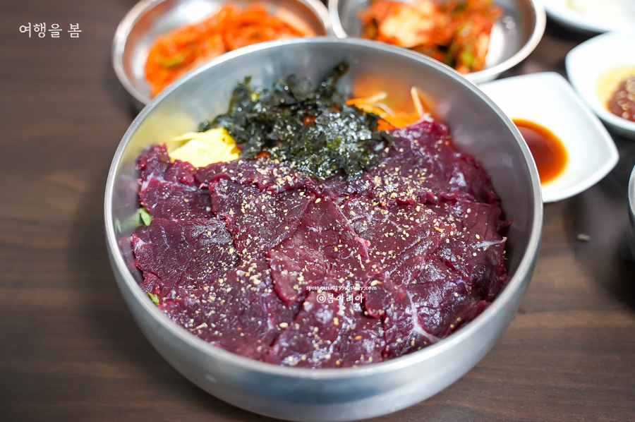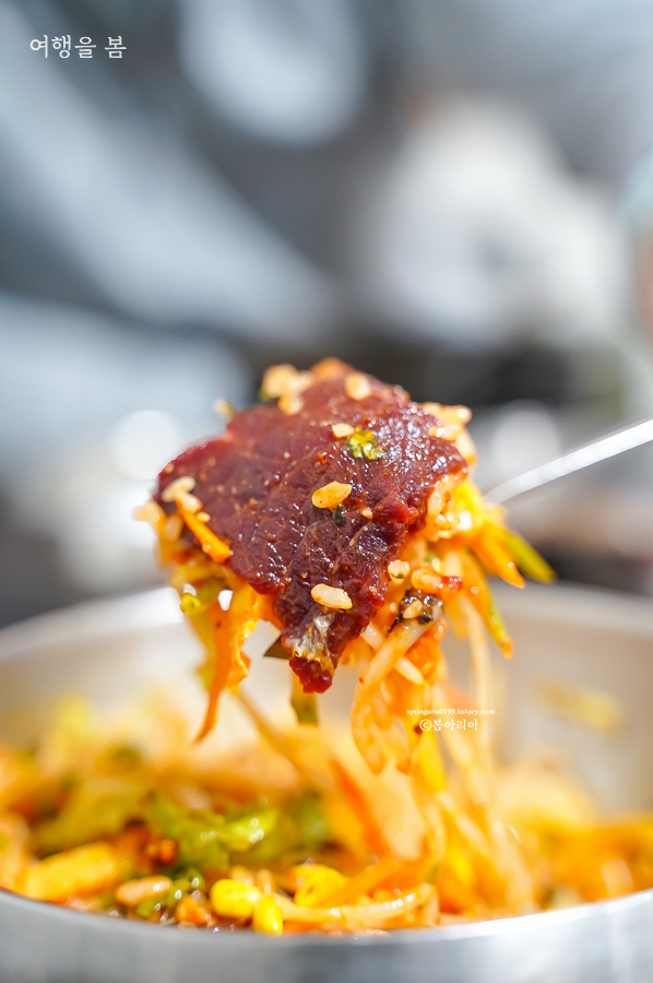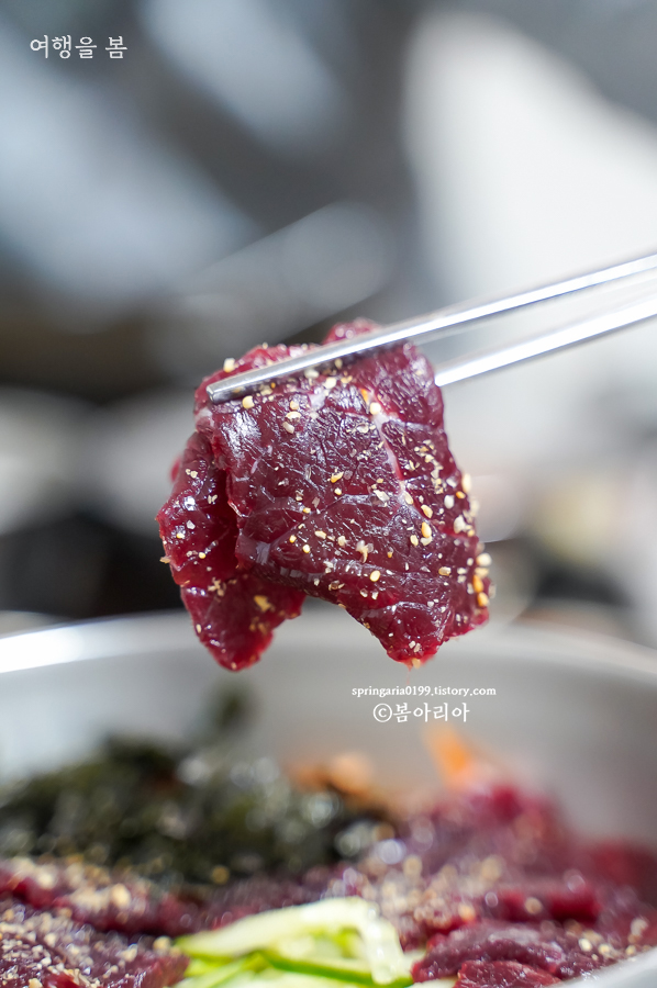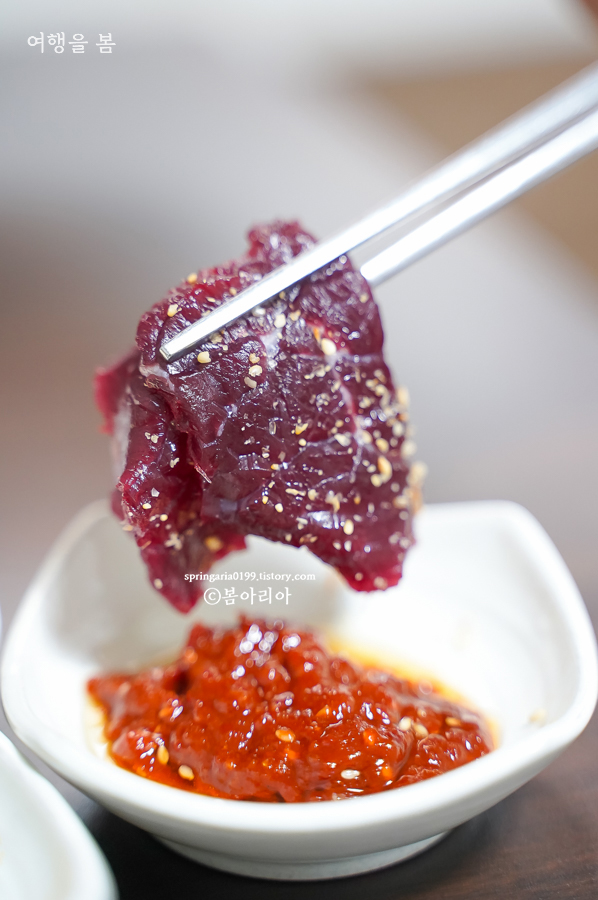 이왕이면 생고기 비빔밥을 추천한다. 생고기 비빔밥은 함평처럼 우시장이 크게 형성된 지역에서만 먹을 수 있고, 육회 비빔밥은 어디서든 먹을 수 있으니까. 생고기는 육사시미다. 듬뿍 얹어있어서 비빔밥 위에 한 줄 정도는 생고기로 즐길 수 있다. 소스도 함께 나온다.