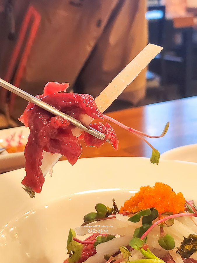 말고기 육회 역시도 쫄깃하면서 부드러웠다. 말고기를 망설이는 사람이라면, 그리고 나 역시도 말고기 특유의 냄새를 걱정했는데 정말 잡내가 없다. 처음 먹어보는 고기이기 때문에 낯선 향이 있기는 하지만 거부감이 없었고, 다음에 또 먹자 하면 먹을 수 있을 만큼 호감이었다.