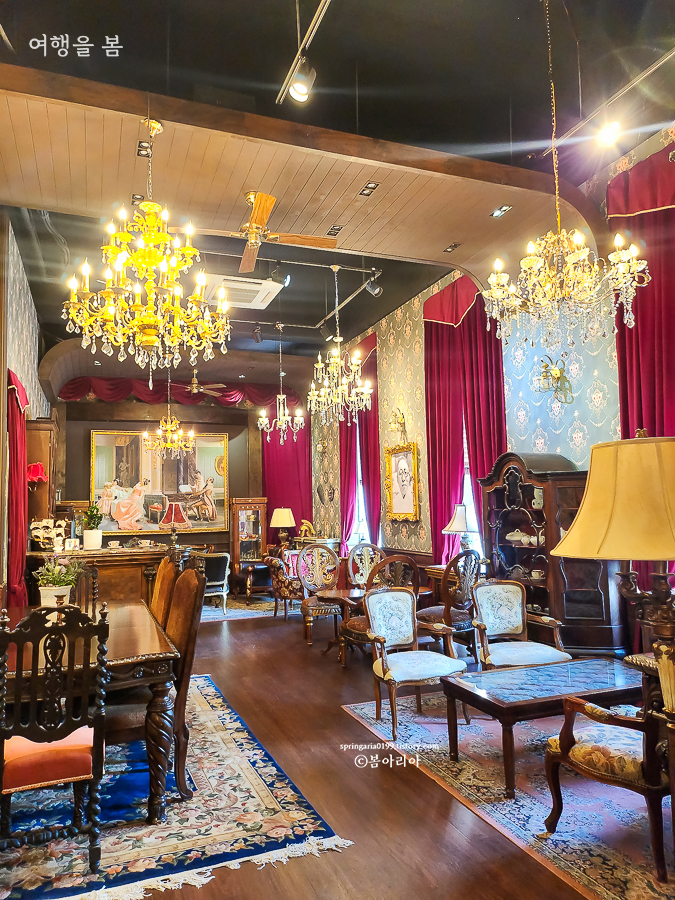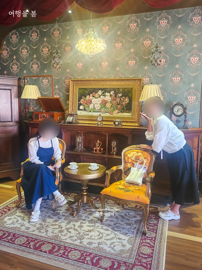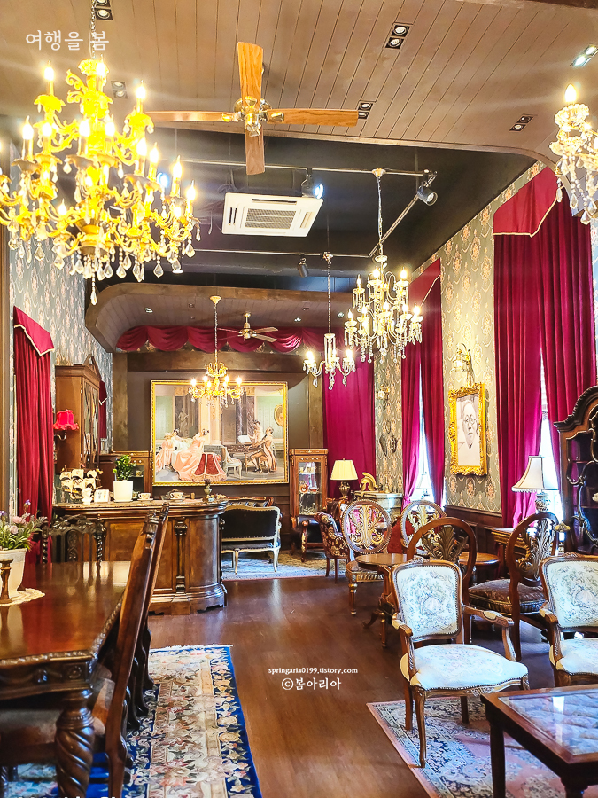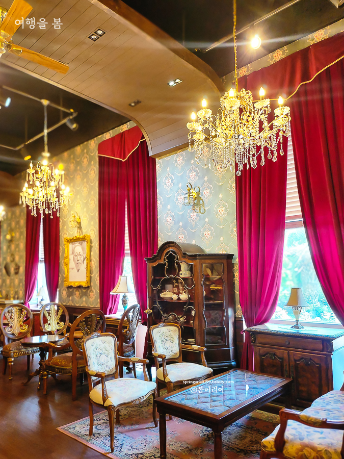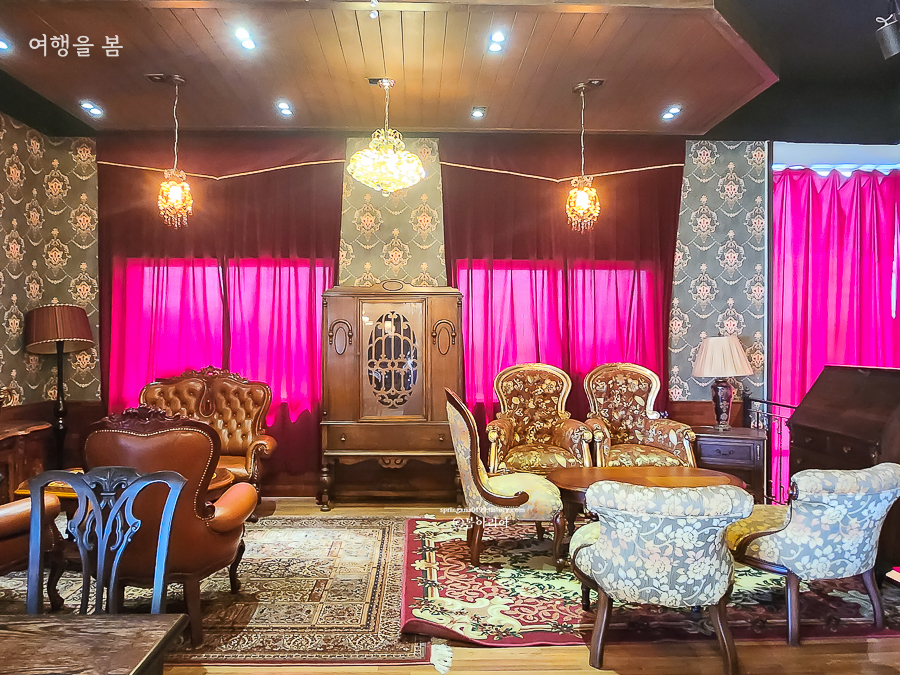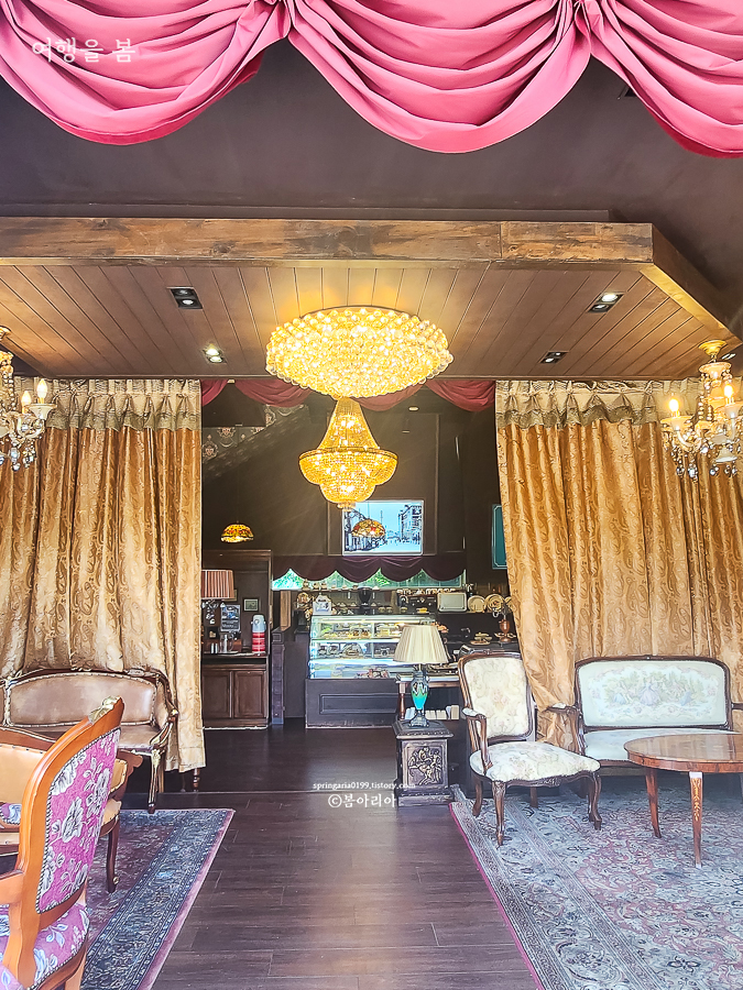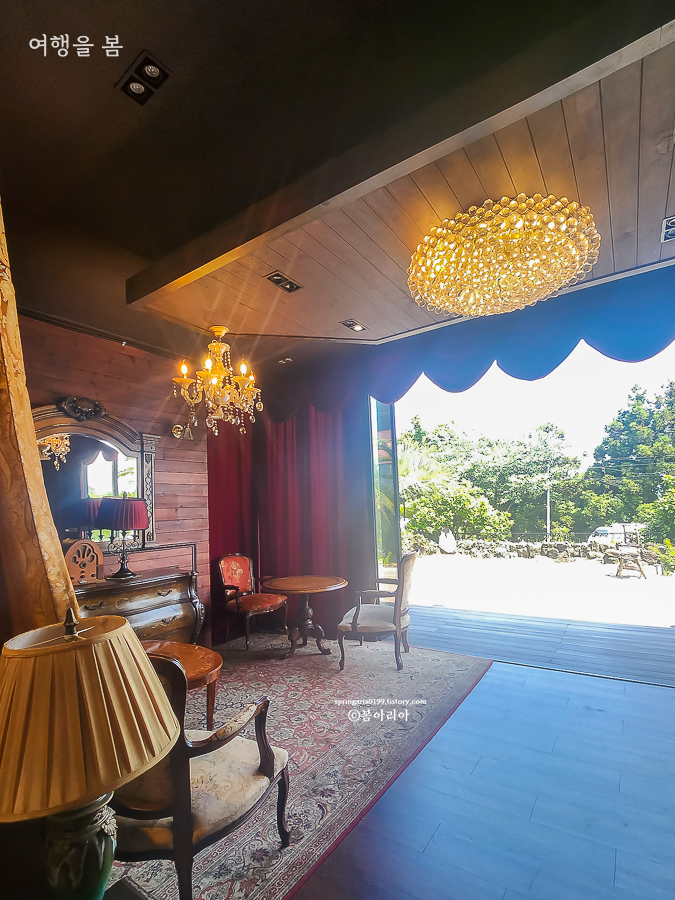 내부는 고풍스러운 샹들리에와 앤티크 가구, 소품들로 꾸며져 있어서 드라마 세트장에 온 느낌이다. 드라마 '미스터 션샤인'의 글로리 호텔 같은 느낌이랄까. 경성살롱 서귀포점 곳곳이 포토존이다.