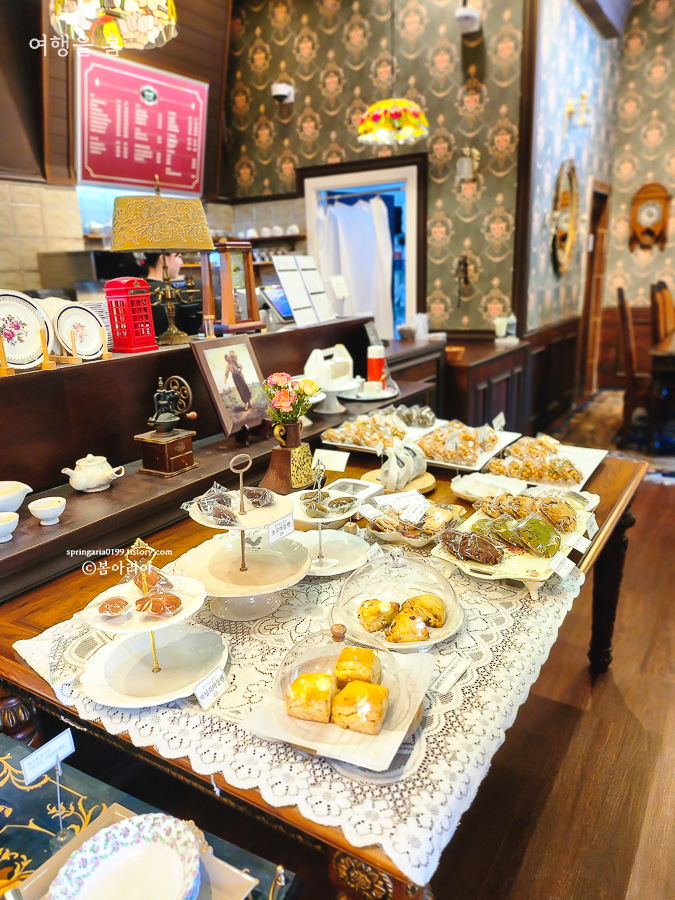 2층은 1층보다 좌석이 많고, 개화기 시대 감성 표현이 더 잘되어 있다. 샹들리에와 앤티크 가구, 소품 모두 분위기와 잘 어울렸다. 어디에 앉을지 결정을 못하고 여기저기 구경하고, 앉아보느라 바빴다. 60대 어머님들도 카페에 오셨는데 분위기 너무 좋다며 어머님들도 사진을 많이 찍으셨고,