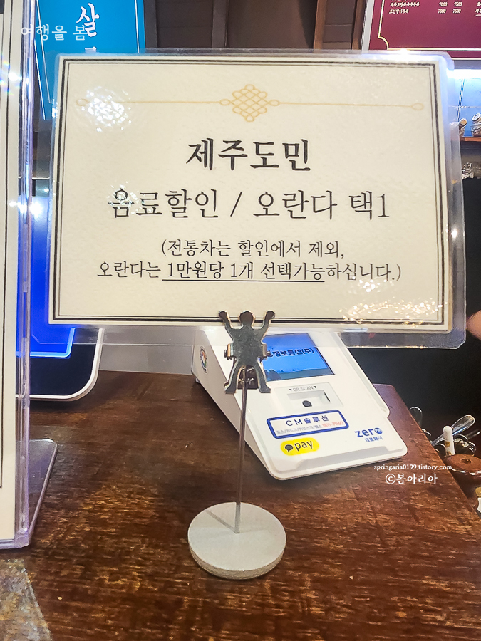 제주도민은 음료 할인을 받거나, 오란다를 서비스로 받을 수 있다. 우리는 음료 할인을 받았다.