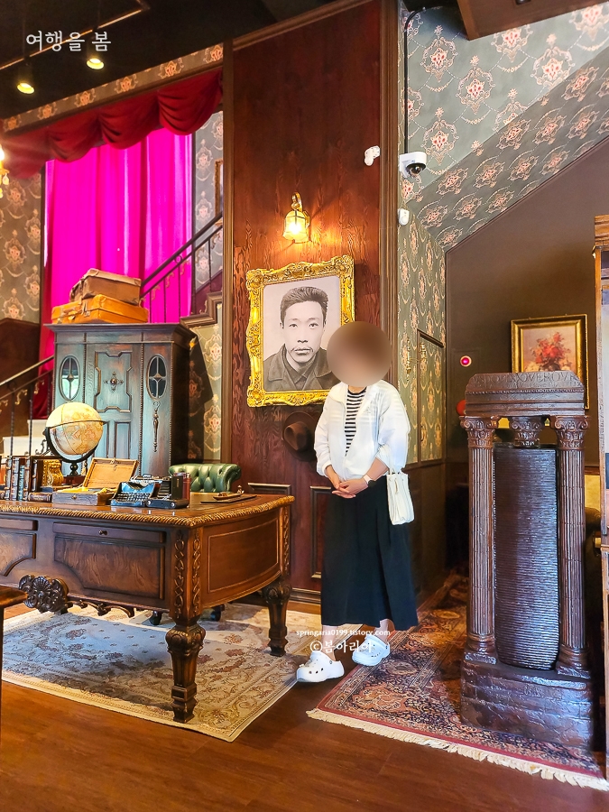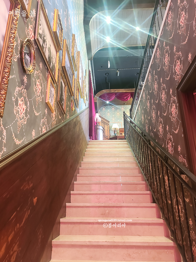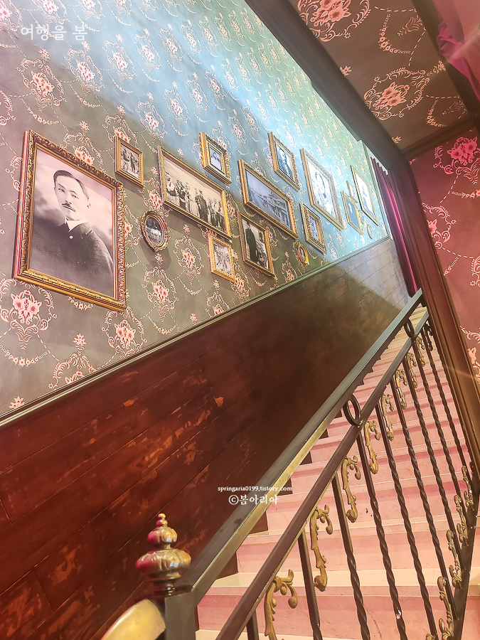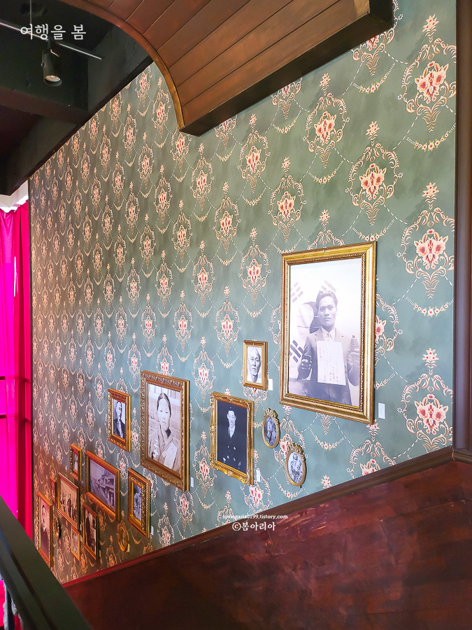 경성살롱 서귀포점의 2층으로 올라가는 계단은 카페를 더 돋보이게 만드는 공간이었다. 계단 벽면에 독립운동가들의 사진이 전시되어 있어 개화기 분위기와 역사적 감성까지 모두 잡았다. 벽지와 계단도 모두 개화기 시대 호텔의 그런 느낌이라 시간 여행을 하는 느낌이랄까.