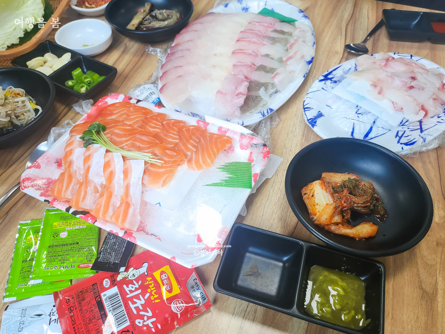 연어회는 다른 곳과 두께와 신선함이 모두 달랐고, 고소하고 부드러워 모두의 만족도가 높았다. 15000원 주고 주문한 매운탕도 너무 맛있어서 모두 밥 말아먹느라 바빴고, 매운탕 재료는 좋아하는 물고기 종류를 골라 수산시장에서 사 오는 게 좋다.