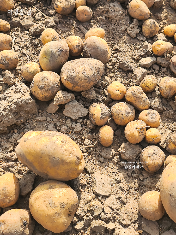 날씨가 따뜻한 제주도는 감자를 일 년에 세 번씩 농사짓는다 그런다. 보통 2월쯤 겨울 감자를 수확하고, 수확 후 못난이들을 버린 모양인데, 상태 너무 좋음.