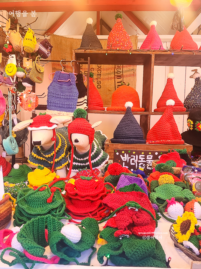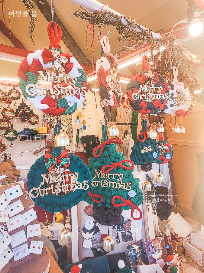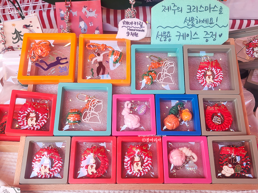 야외에 있는 크리스마스 마켓이다. 그러니까 다른 시기엔 이런 거 없고, 딱 한 달동안만 이렇게 마켓이 열린다. 물건도 비싸지 않다. 산타 양말 2켤레에 5천 원이고, 키링도 3개에 1만 5천 원? 해녀키링처럼 제주도에서만 볼 수 있는 것들도 많다.